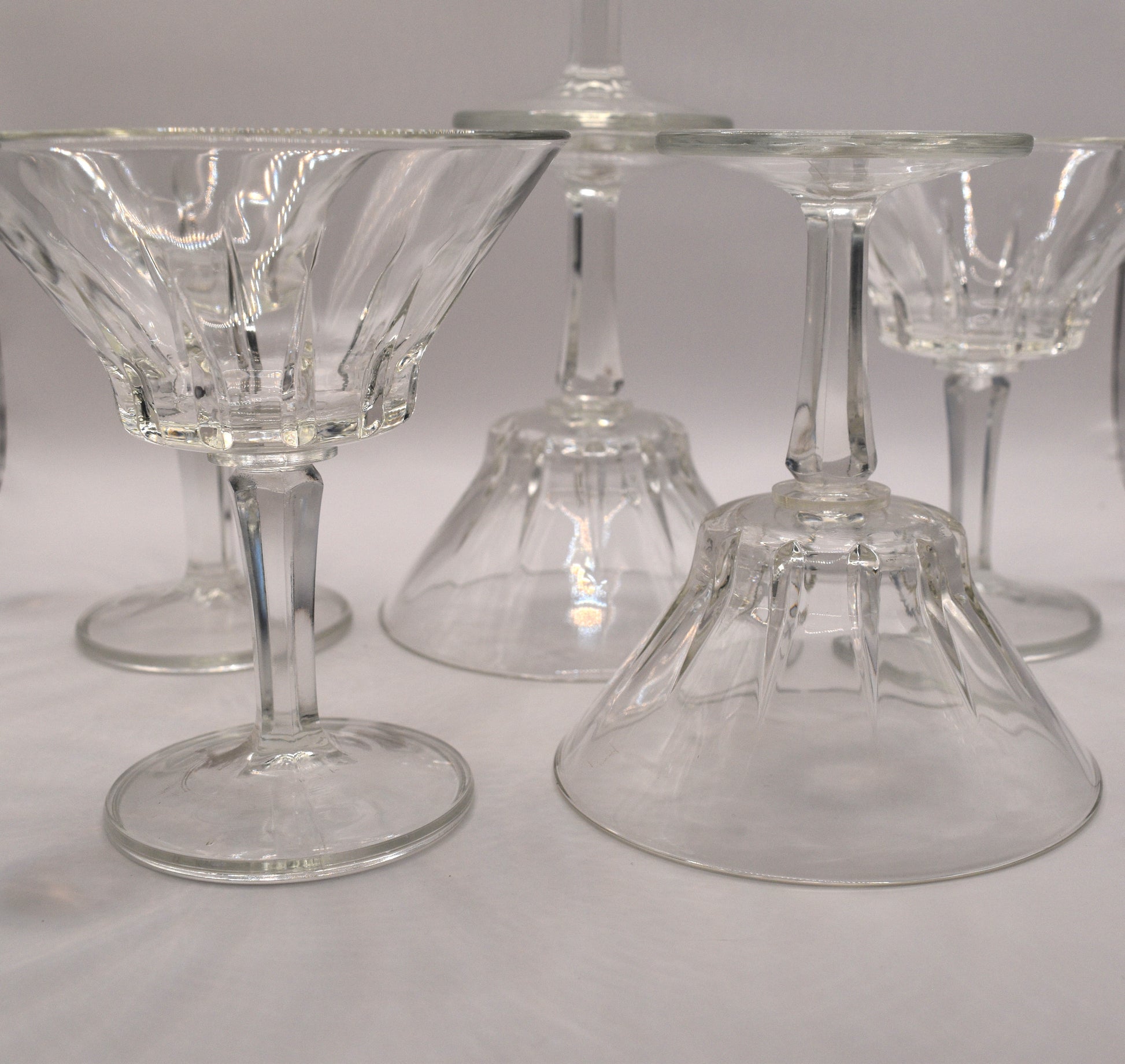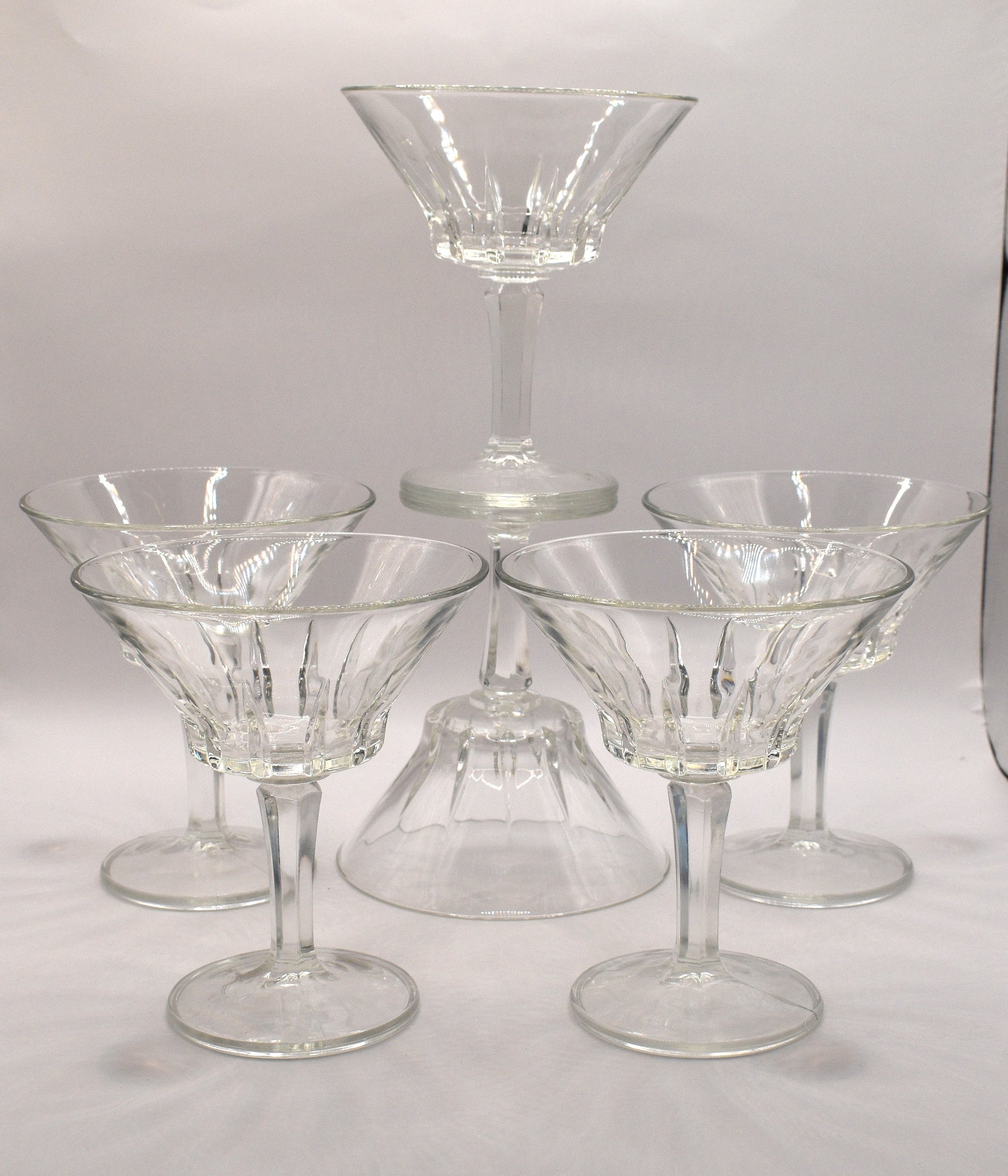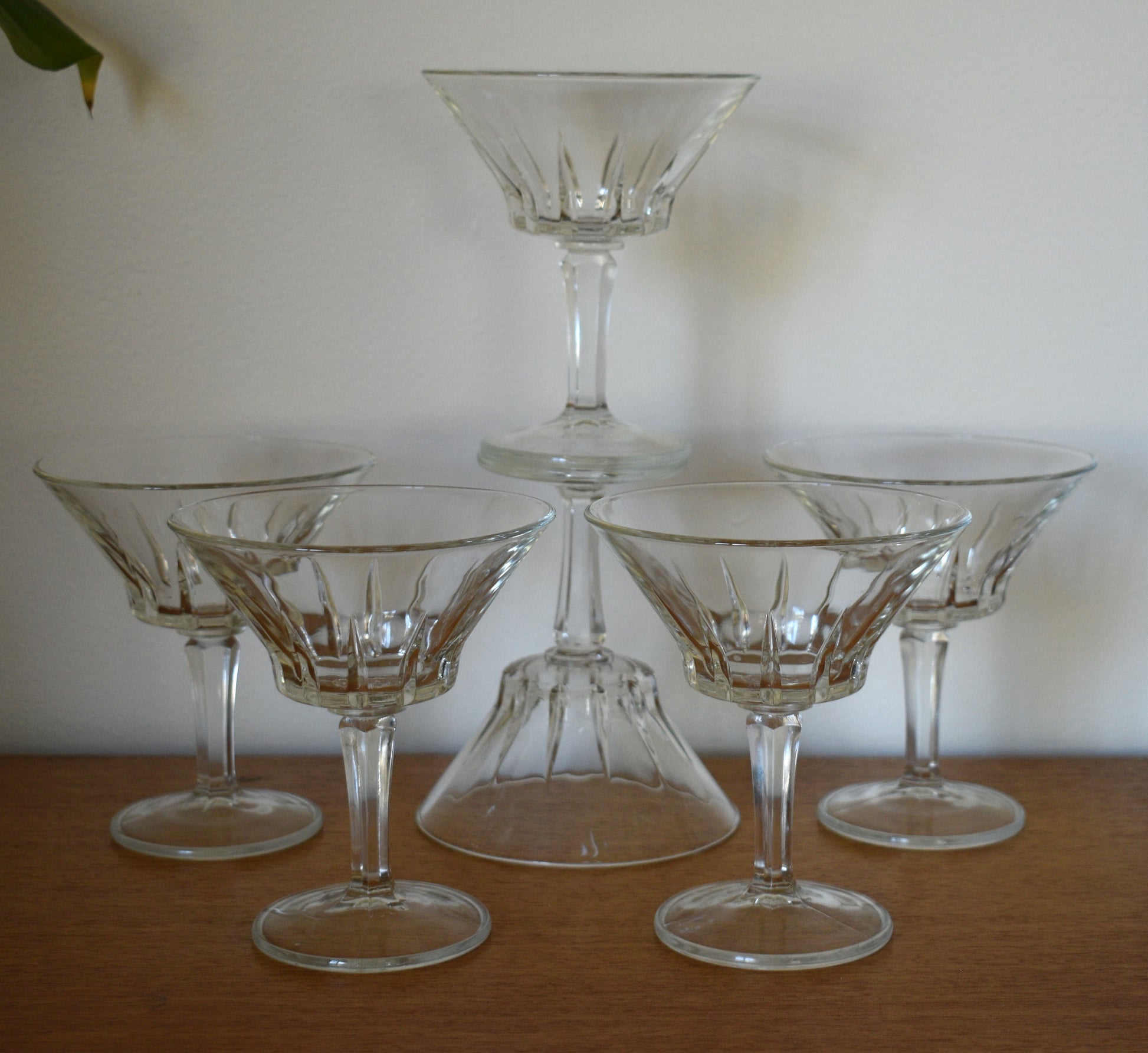 Set of 6 Champagne coupes or tall dessert glasses with wide open rim. All glasses are stamped with Italy on the bottom and are in excellent condition.