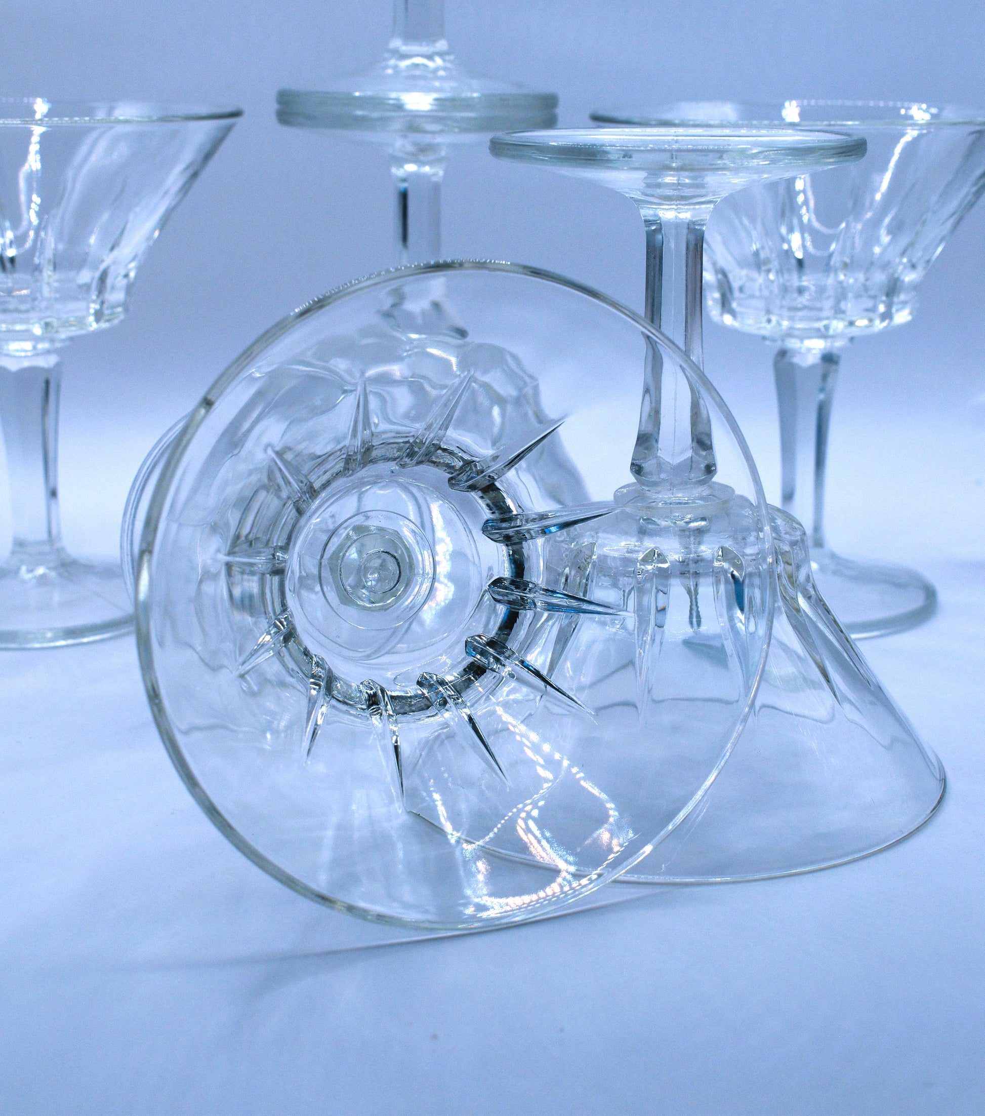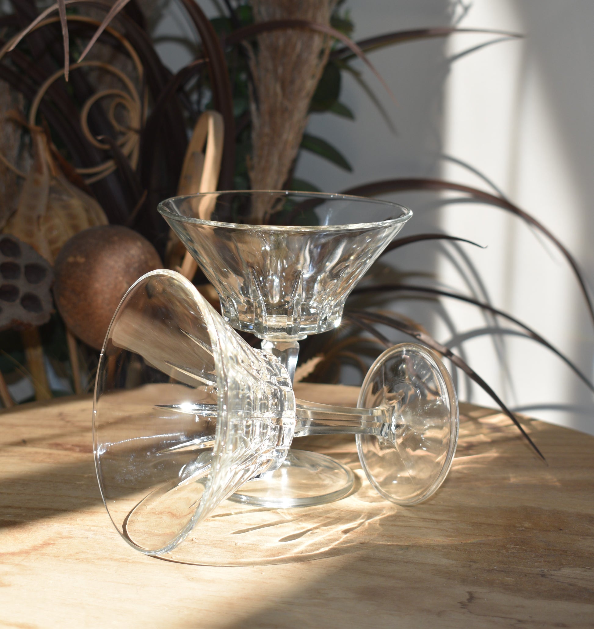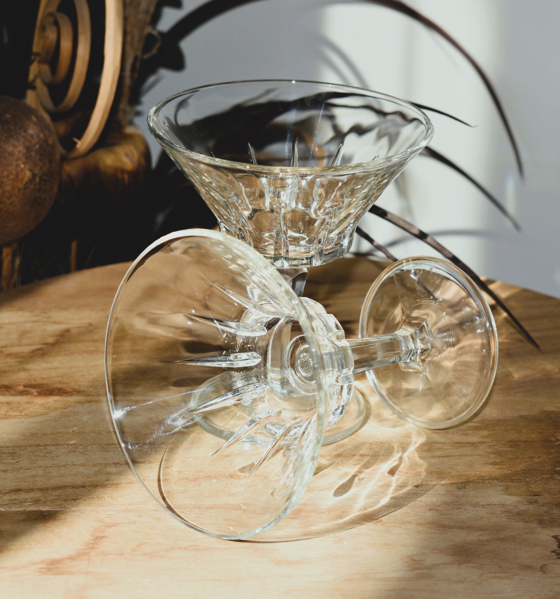 Set of 6 Champagne coupes or tall dessert glasses with wide open rim. All glasses are stamped with Italy on the bottom and are in excellent condition.