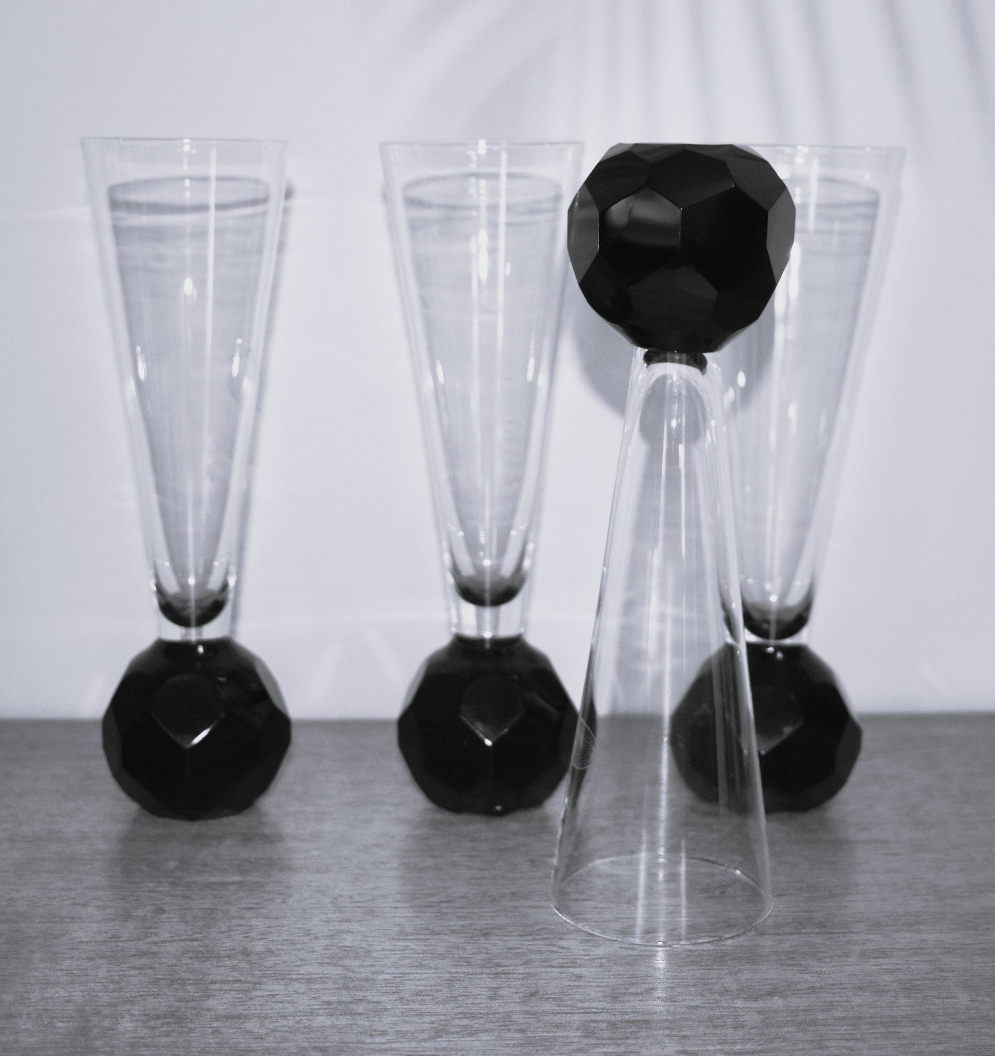 Champagne Flutes - Stemless - Black faceted Ball foot. Set of 4