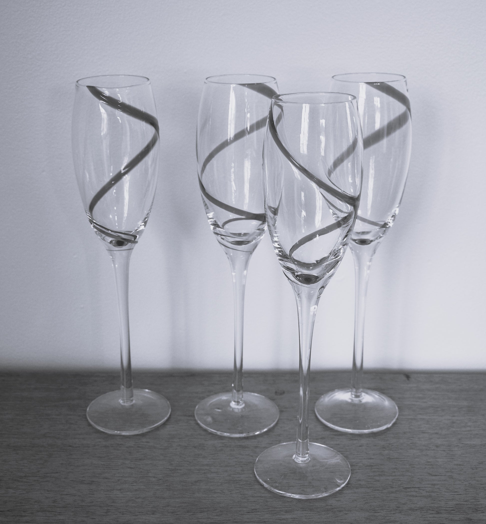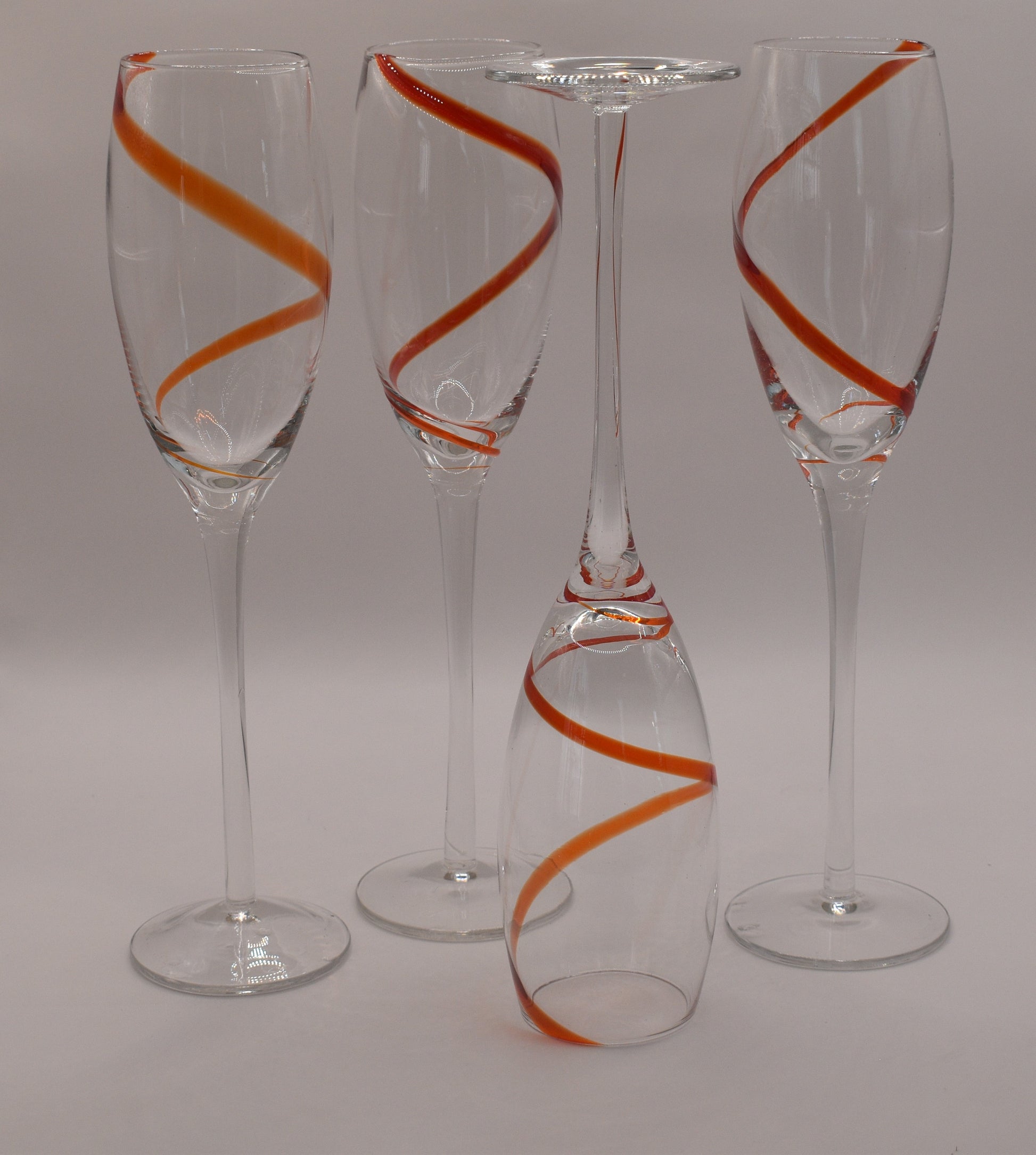 Champagne Glasses / Pier 1 Red Swirline Glasses / Hand Blown Glasses / Vintage Pier 1 Glassware - Champagne Flute / Red Ribbon Glasses. Set of 4