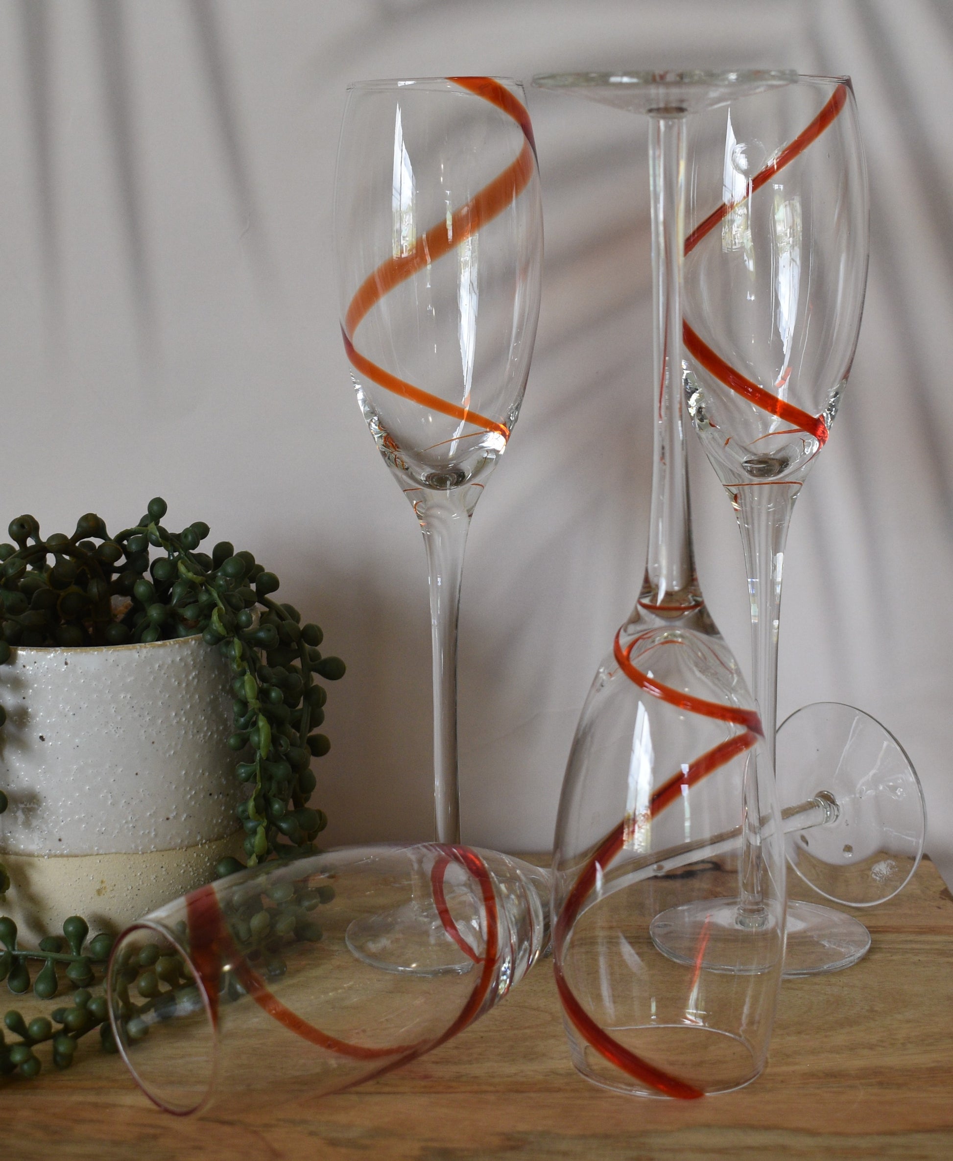 Fabulous set of Pier 1 Red Swirline Champagne flutes. Stunning glasses perfect for any celebration. We have 8 in total so if you would like a set of 6 please contact us.