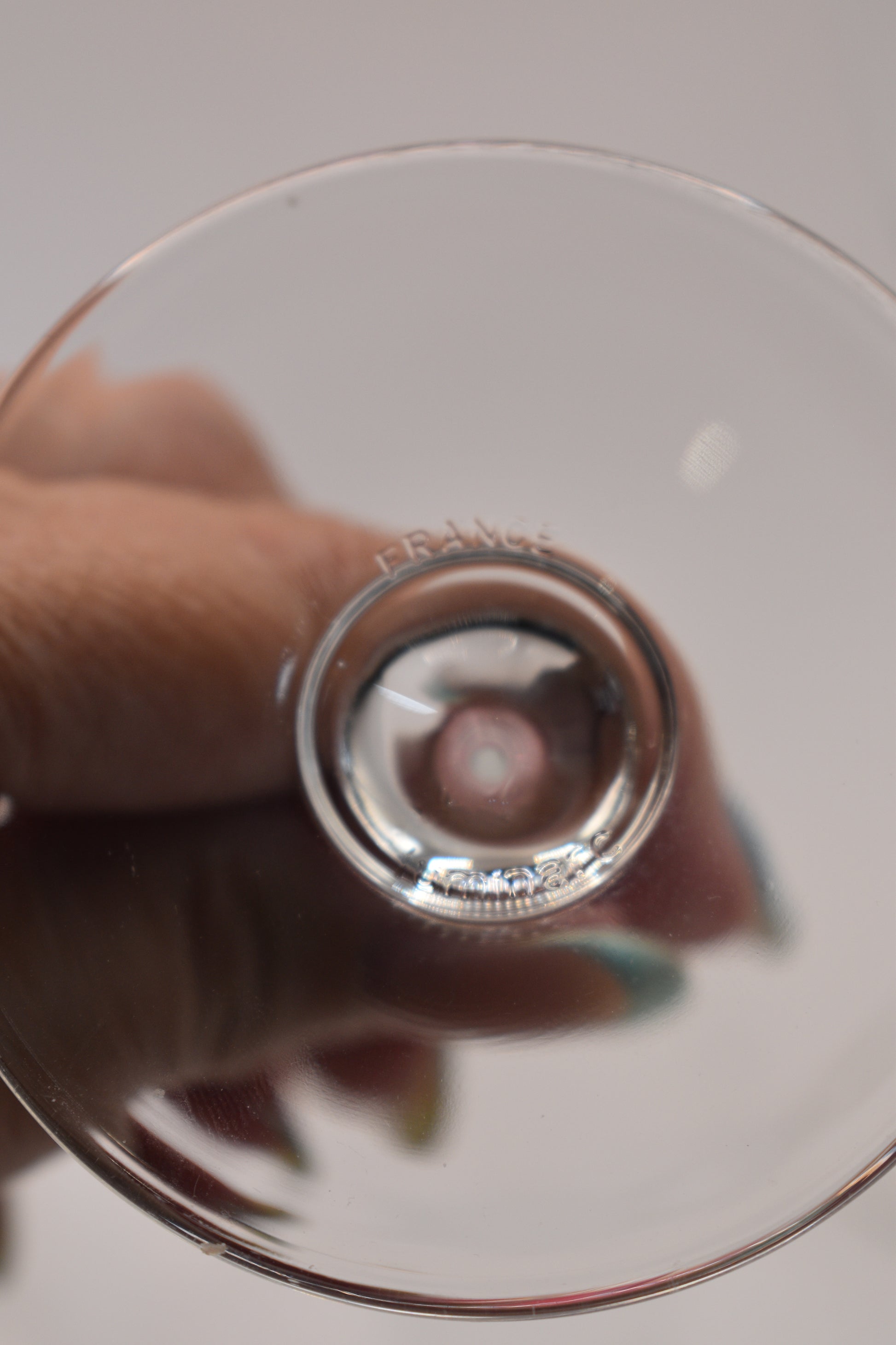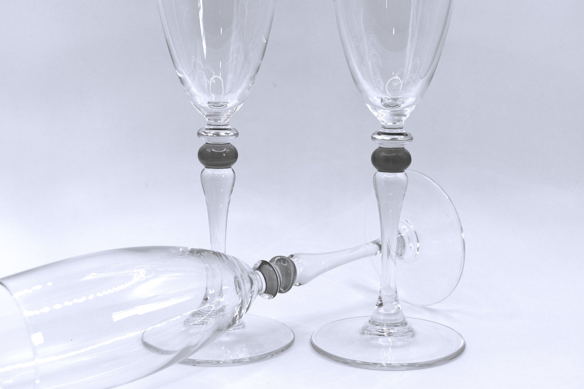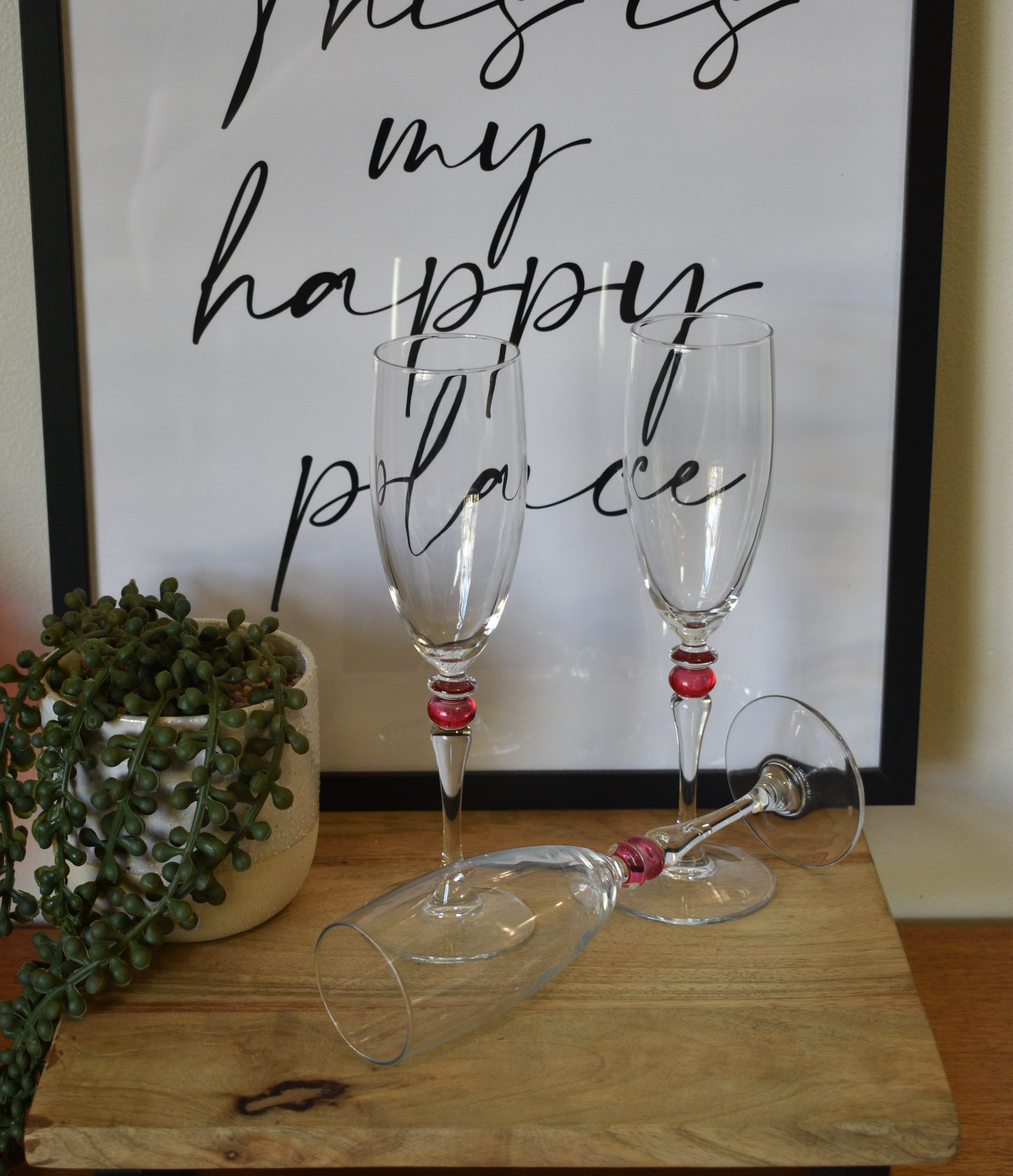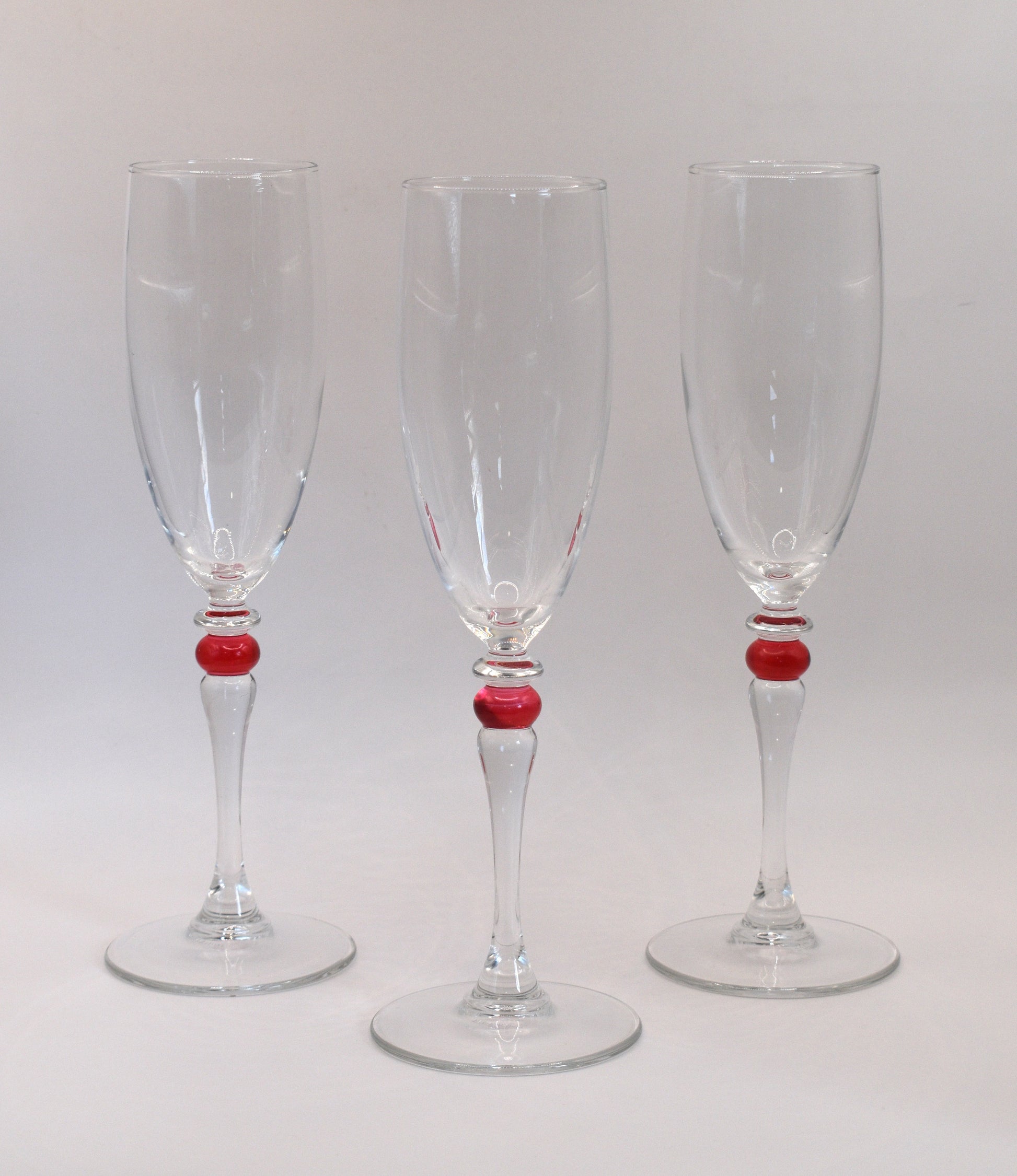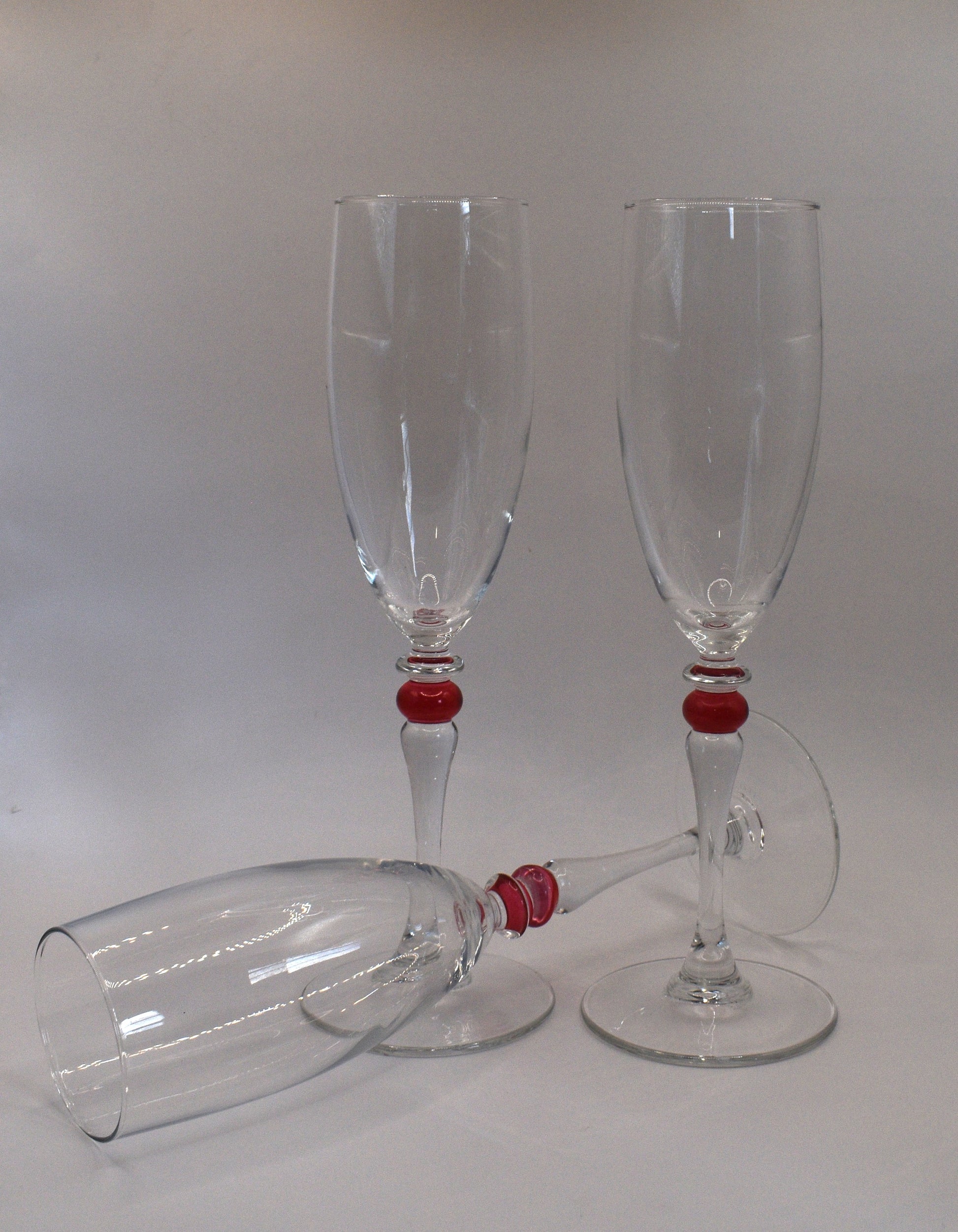 Lovely set of 3 Champagne flutes. Simple design with the stem featuring a red ball and clear wafer.