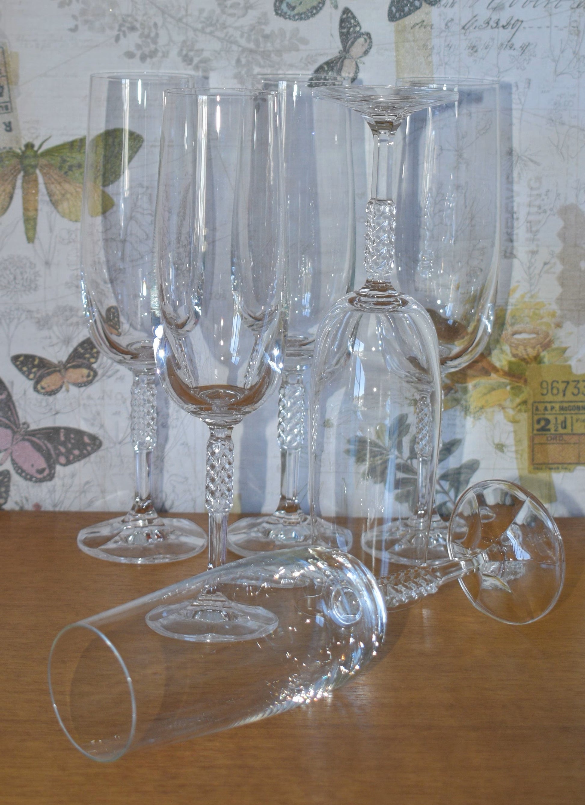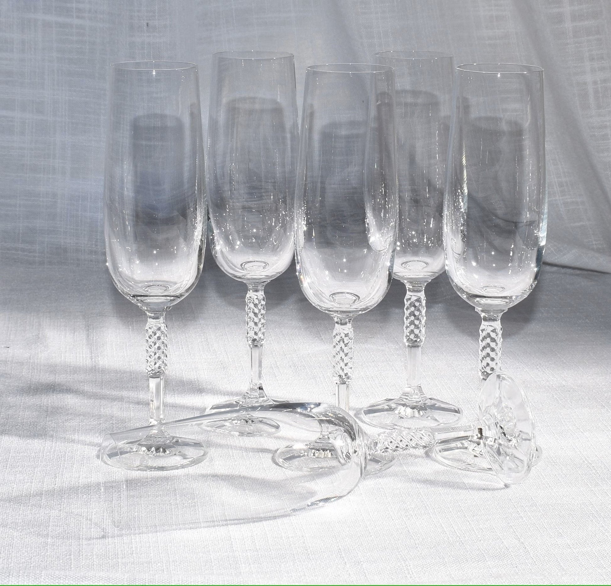 These crystal champagne flutes have a stunning lattice criss cross stem and are crafted with water clear crystal, making them both beautiful and brilliant. Whether for a celebration or as a gift, this set of 6 is perfect in both condition and have a beautiful "ring" sound.