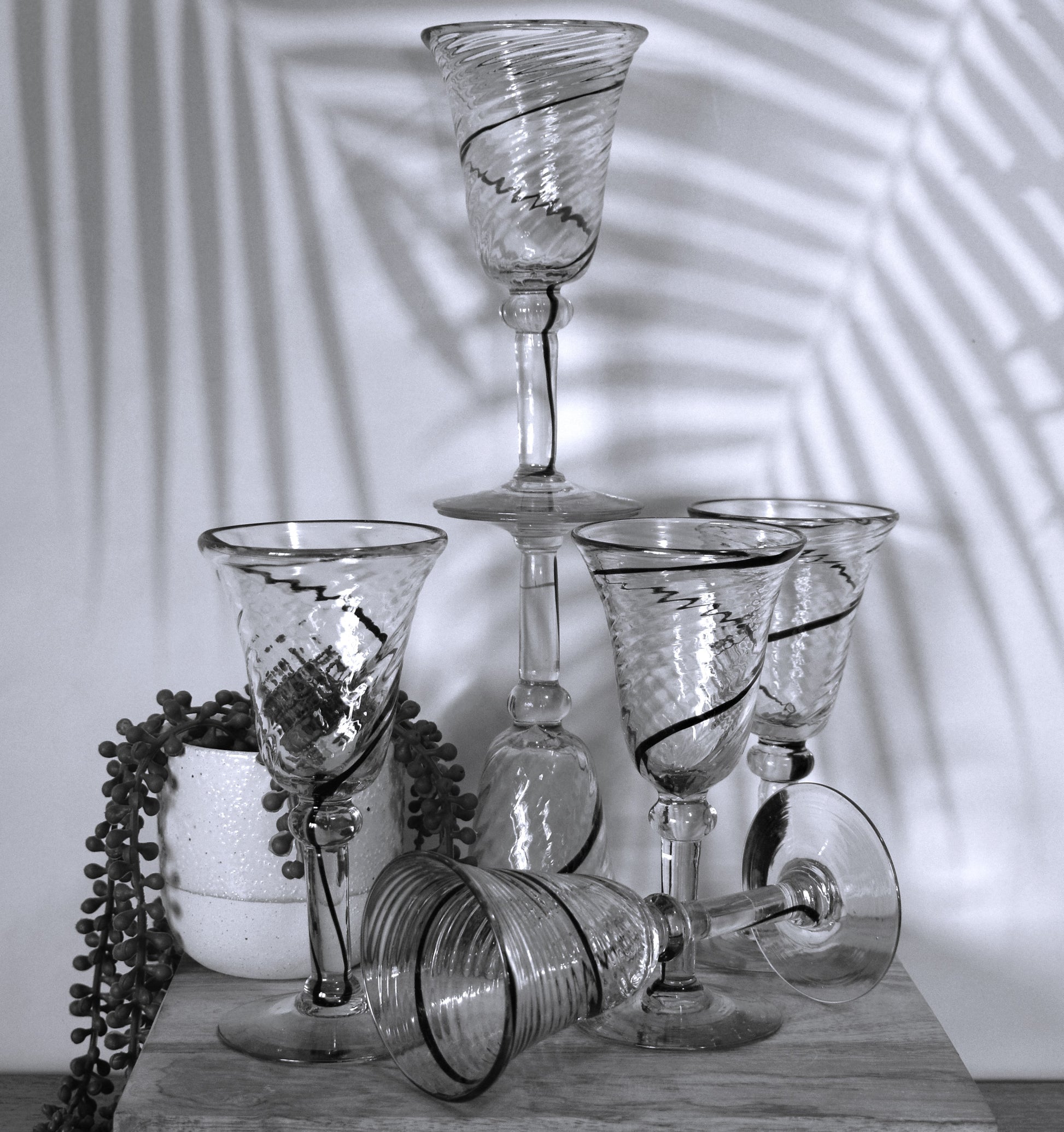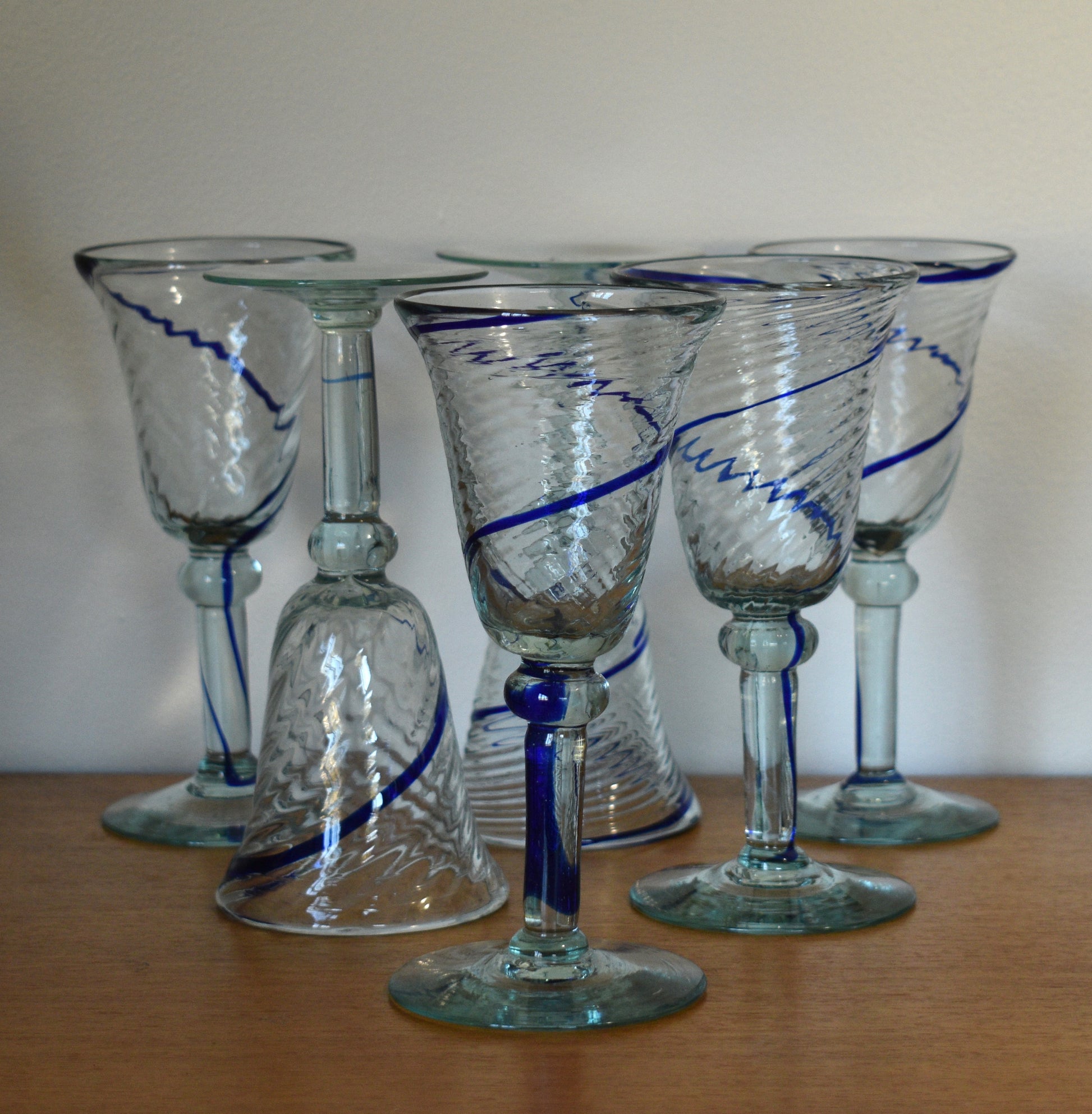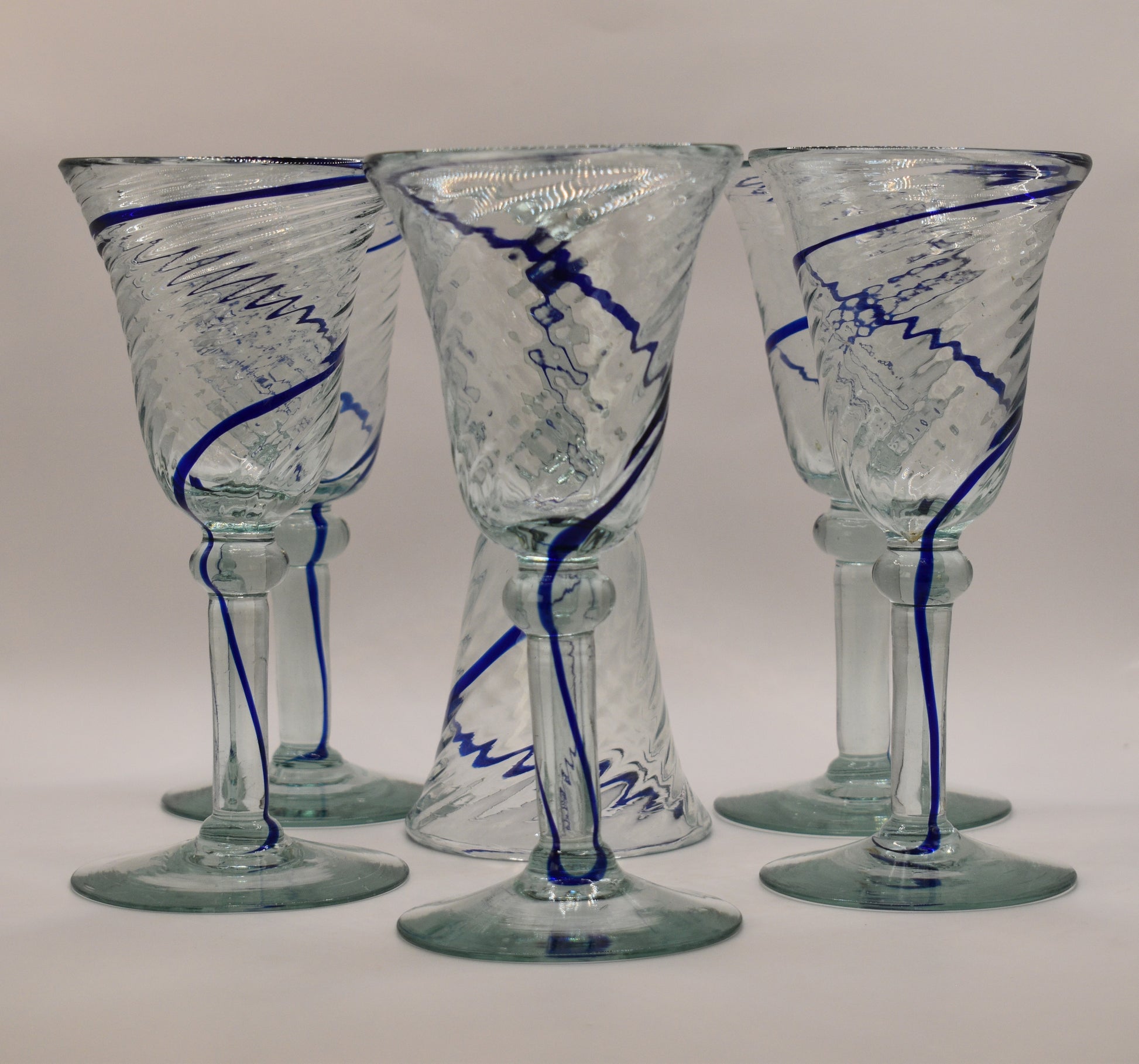 This is a stunning and unique set of six hand blown wine glasses, crafted in Mexico. Each glass boasts a captivating design featuring a swirled glass bowl and elegant cobalt blue swirl that travels around the bowl and down the stem to the foot.