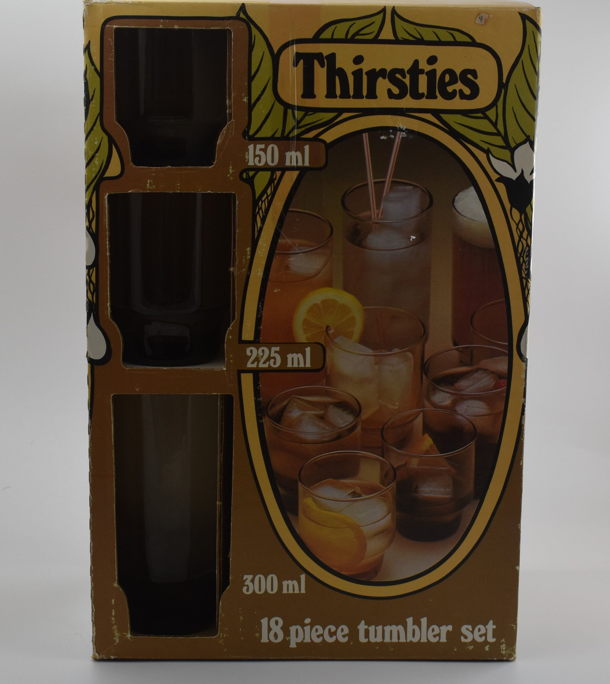 Kaaru “Tasman” 18 piece (Thirsties) boxed set. Glass tumblers - Made in New Zealand. Original packaging Retro glassware
