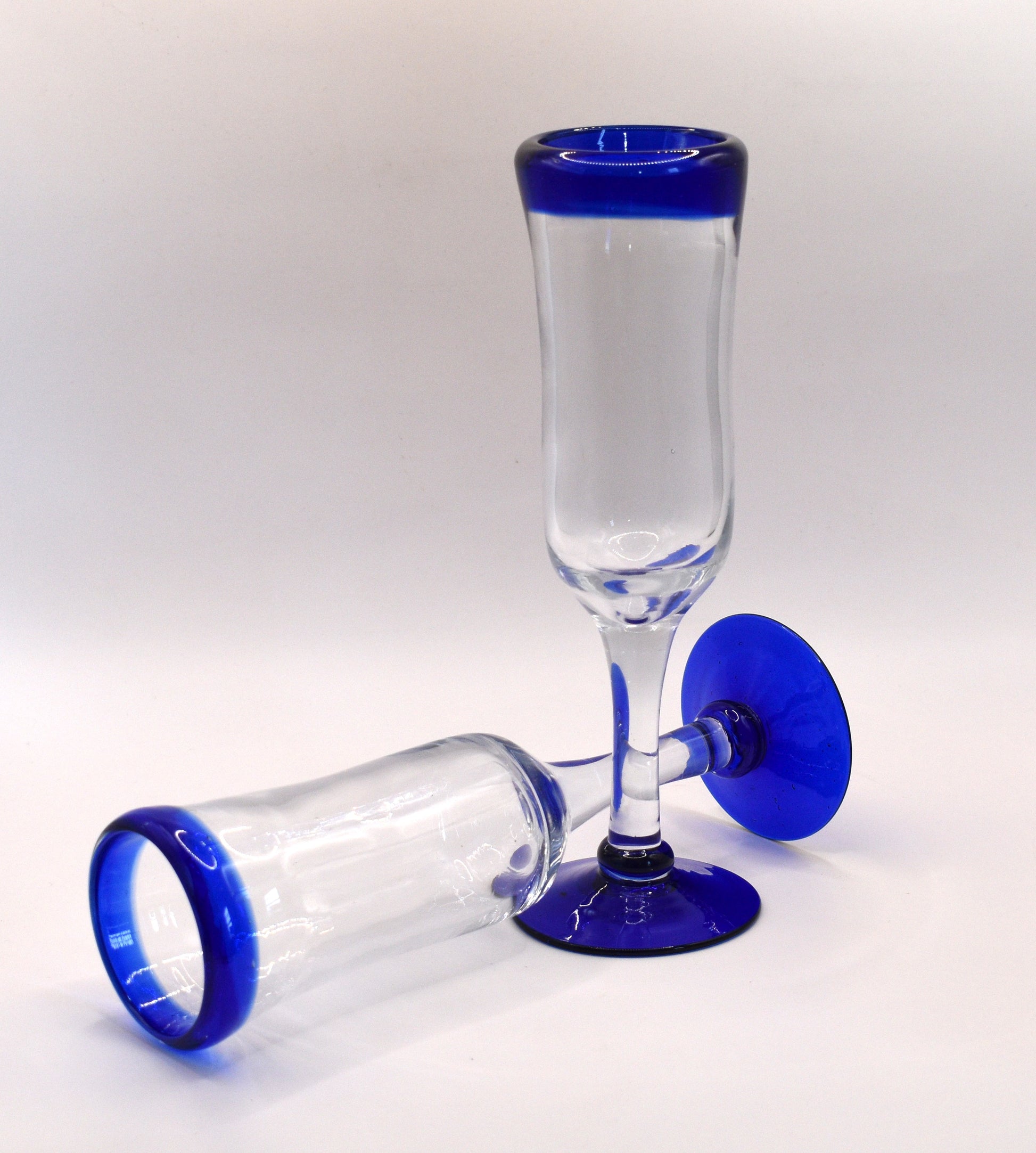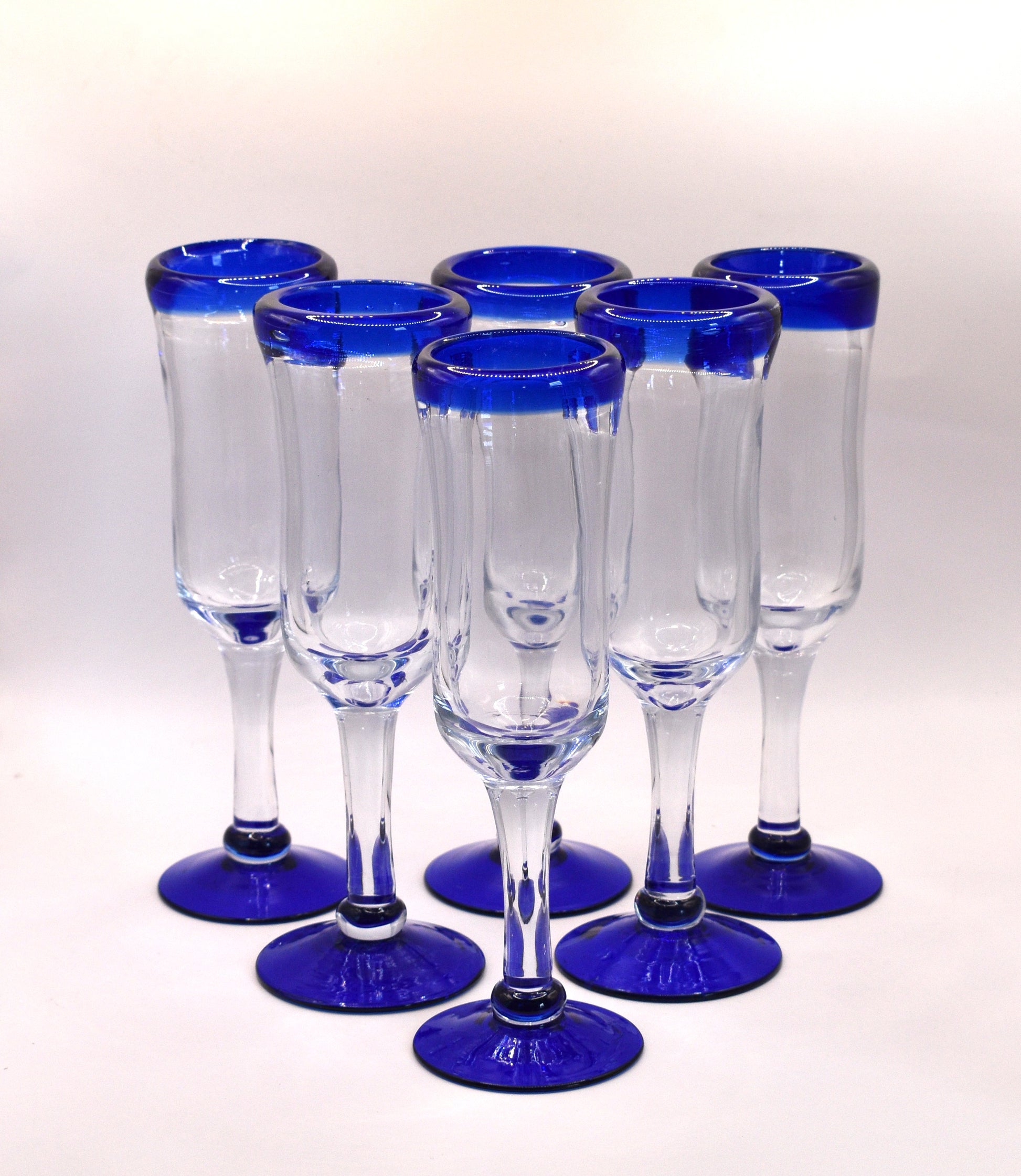 Mexican Hand Blown Cobalt Blue Rim and Foot Champagne Flutes. Set of 6