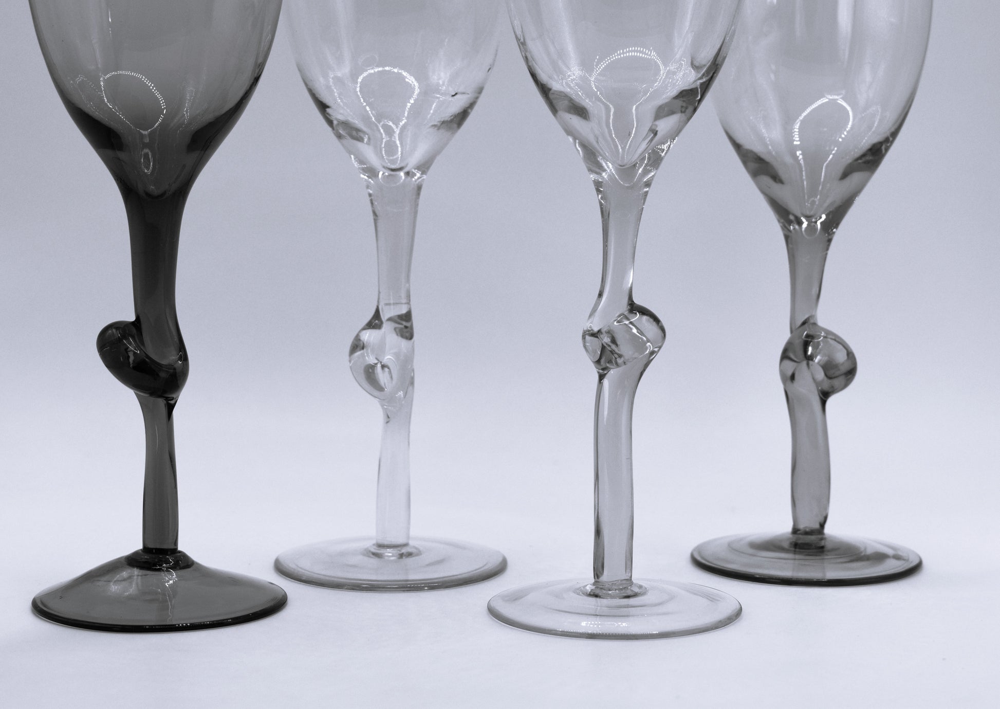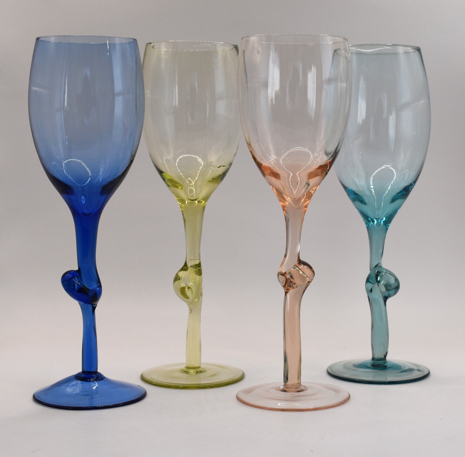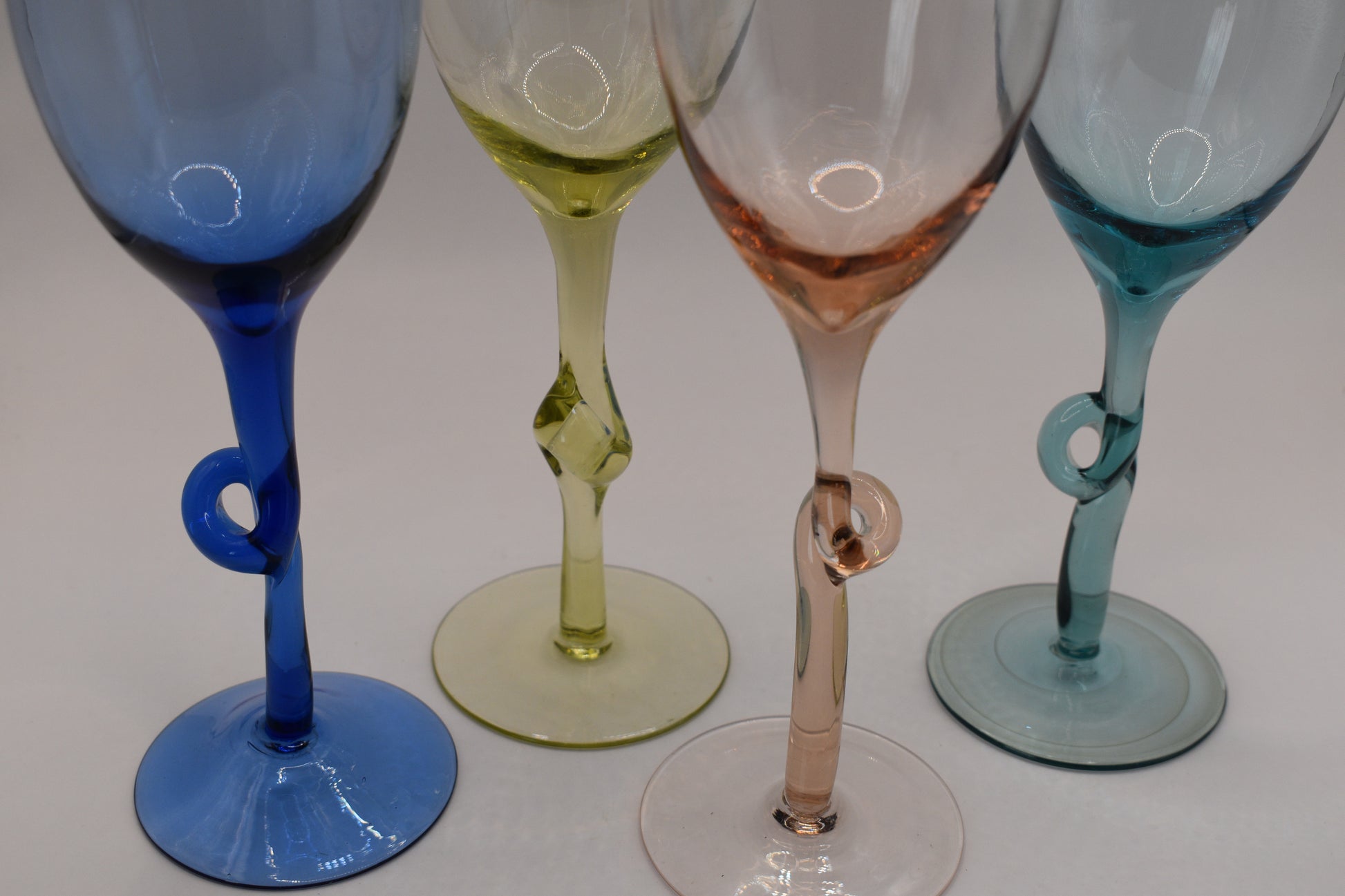 Indulge in the ultimate dining experience with these exquisite harlequin wine glasses. Each glass is a work of art, meticulously handblown with a stunning knotted stem that adds depth and character. The clear colors are lovely and each glass is different in its own way. The Green glass has a longer bowl than the other 3 and a shorter stem but blends it to complete this set of 4
