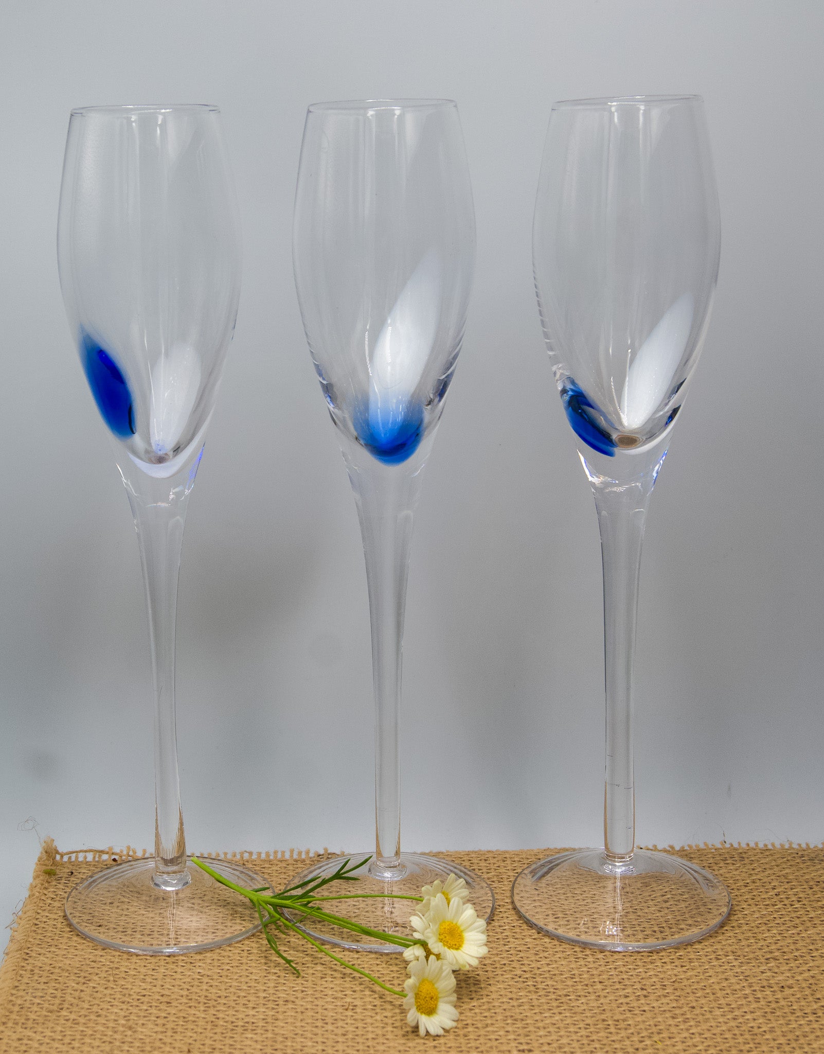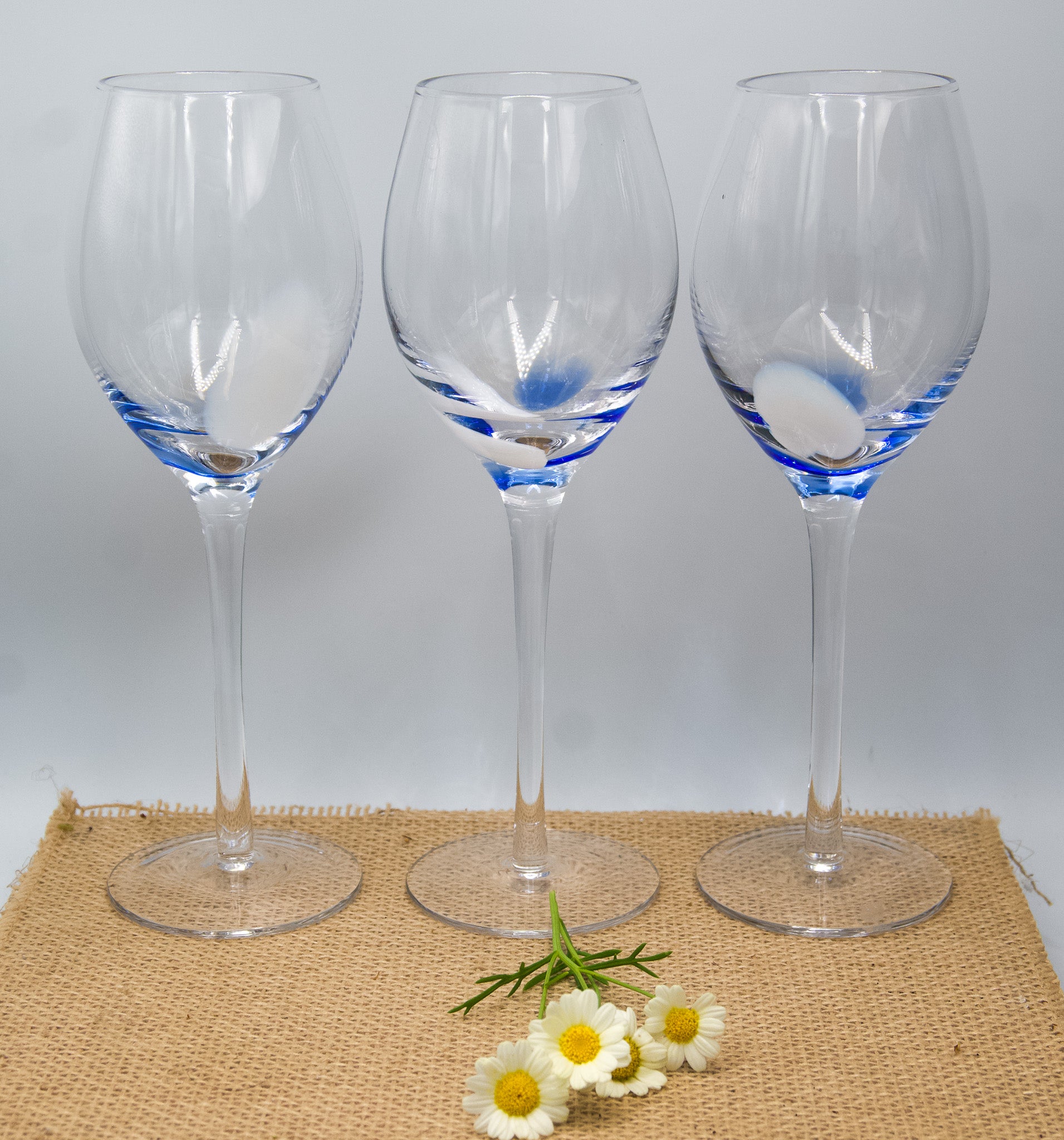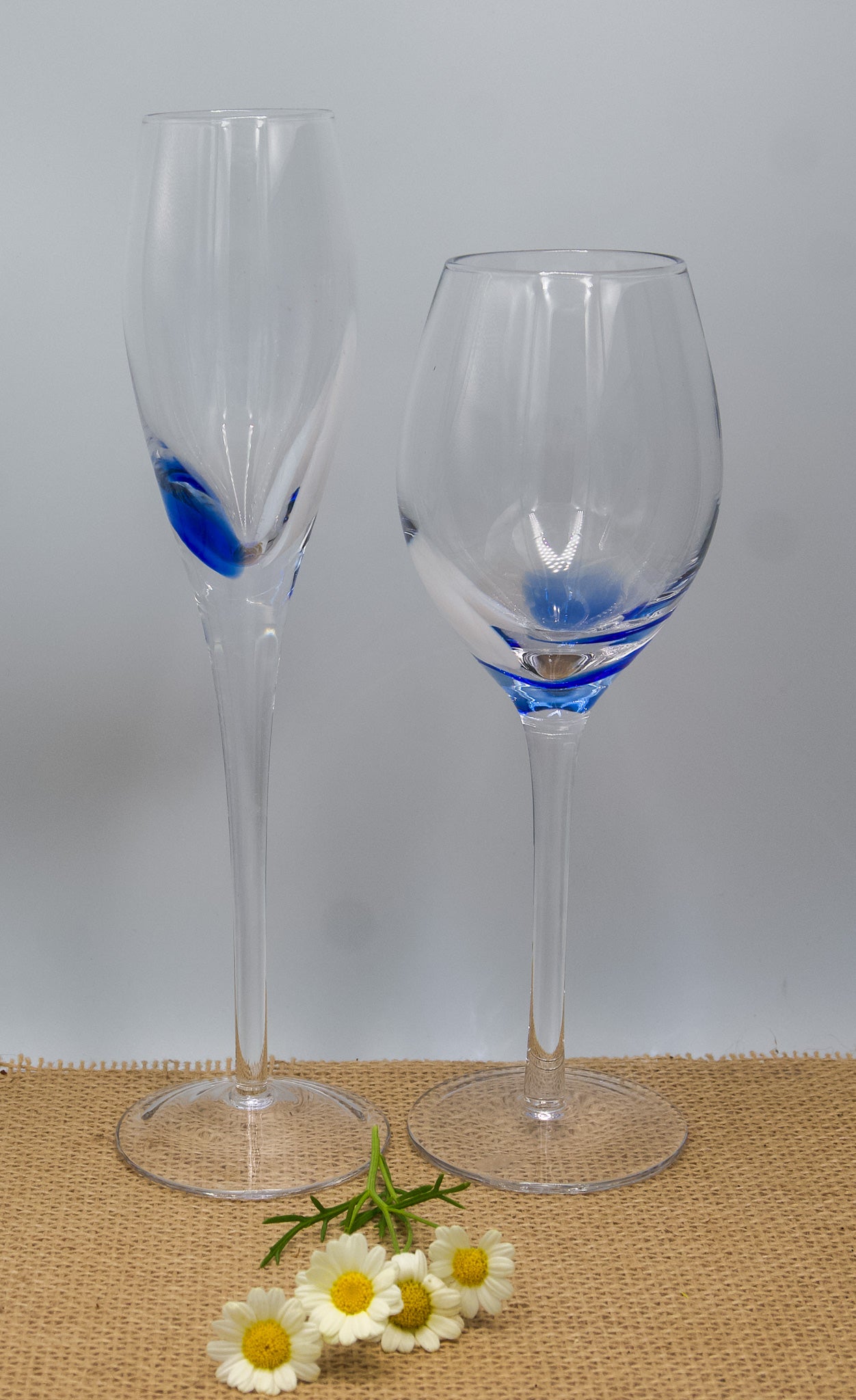 Stunning Mixed Set Of Wine/ Champagne Glasses with white and blue featured flashes at the base of each bowl.These glasses are perfect for a dinner party where the guests have different preferences of what they drink.