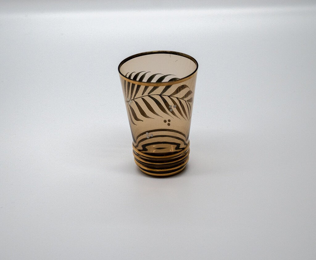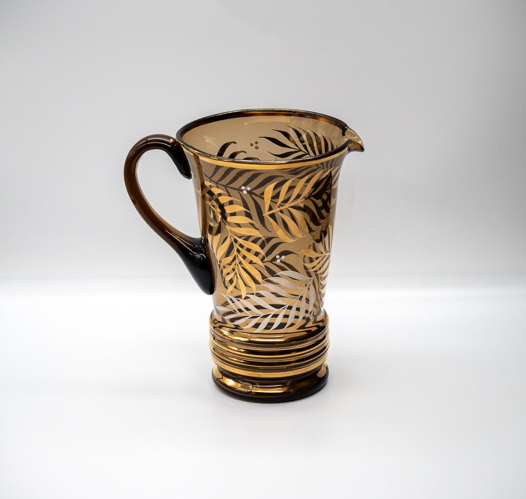 Vintage Amber Water Set With Gold /Silver Plant Fronds and Gold Trim
