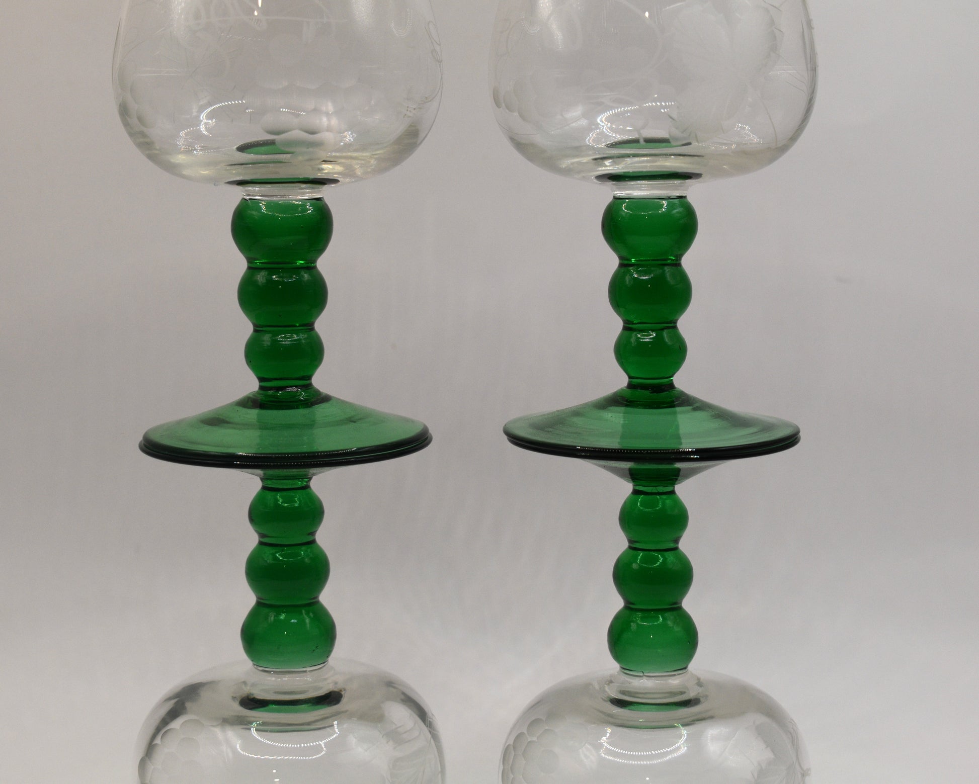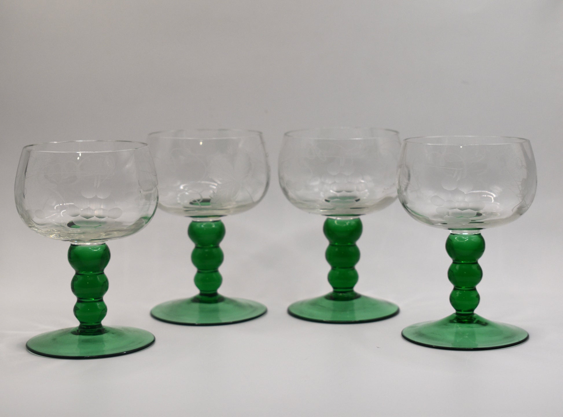 Step back in time with this elegant set of four vintage Austrian Roemer glasses. Featuring emerald-green 3 ball stem and delicately etched clear bowls, featuring grapes and grapevine leaves. These goblets are a stunning example of European glassware craftsmanship. Not only is the bowl beautifully etched it is also has an optic styled bowl which is ribbed on the inside.