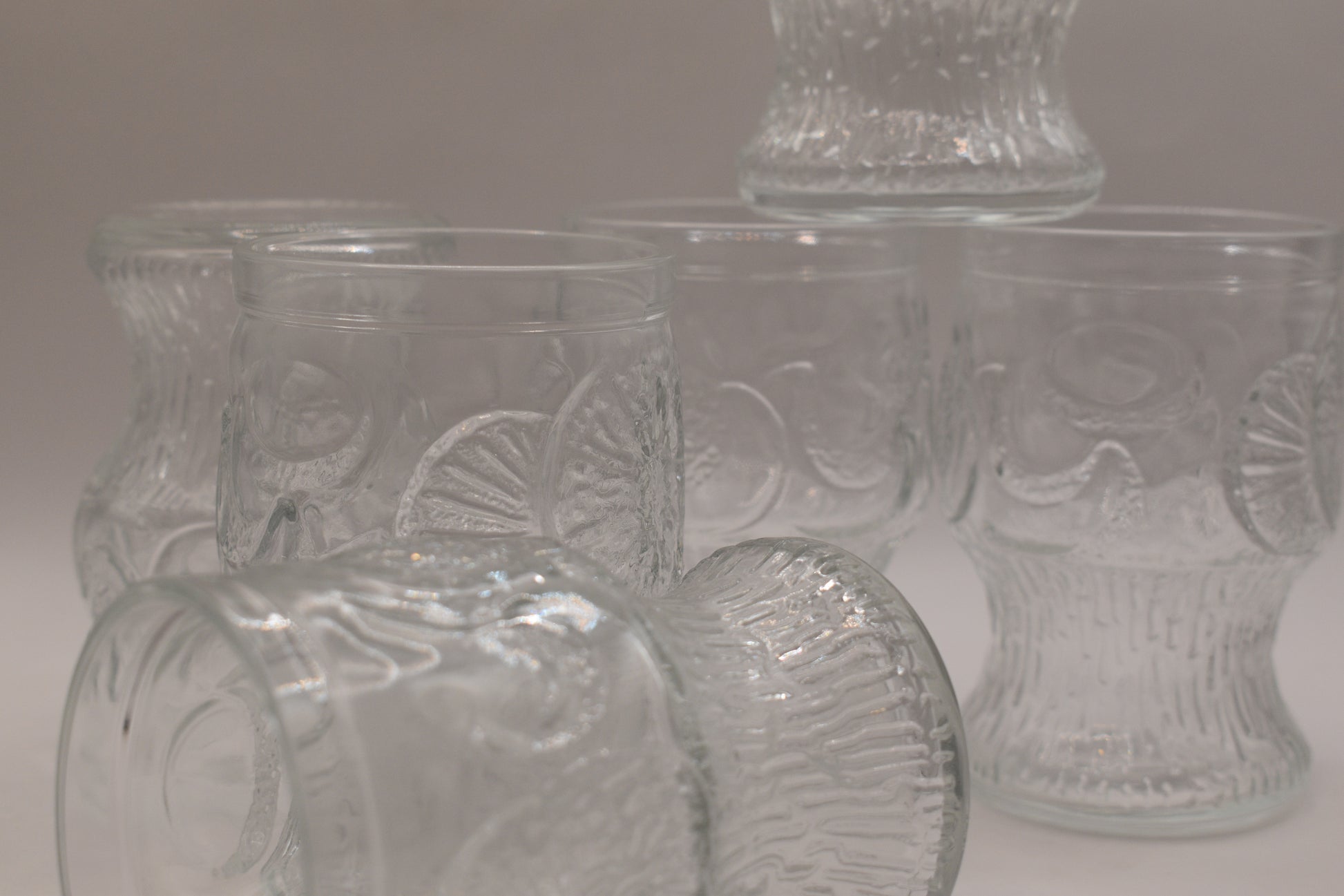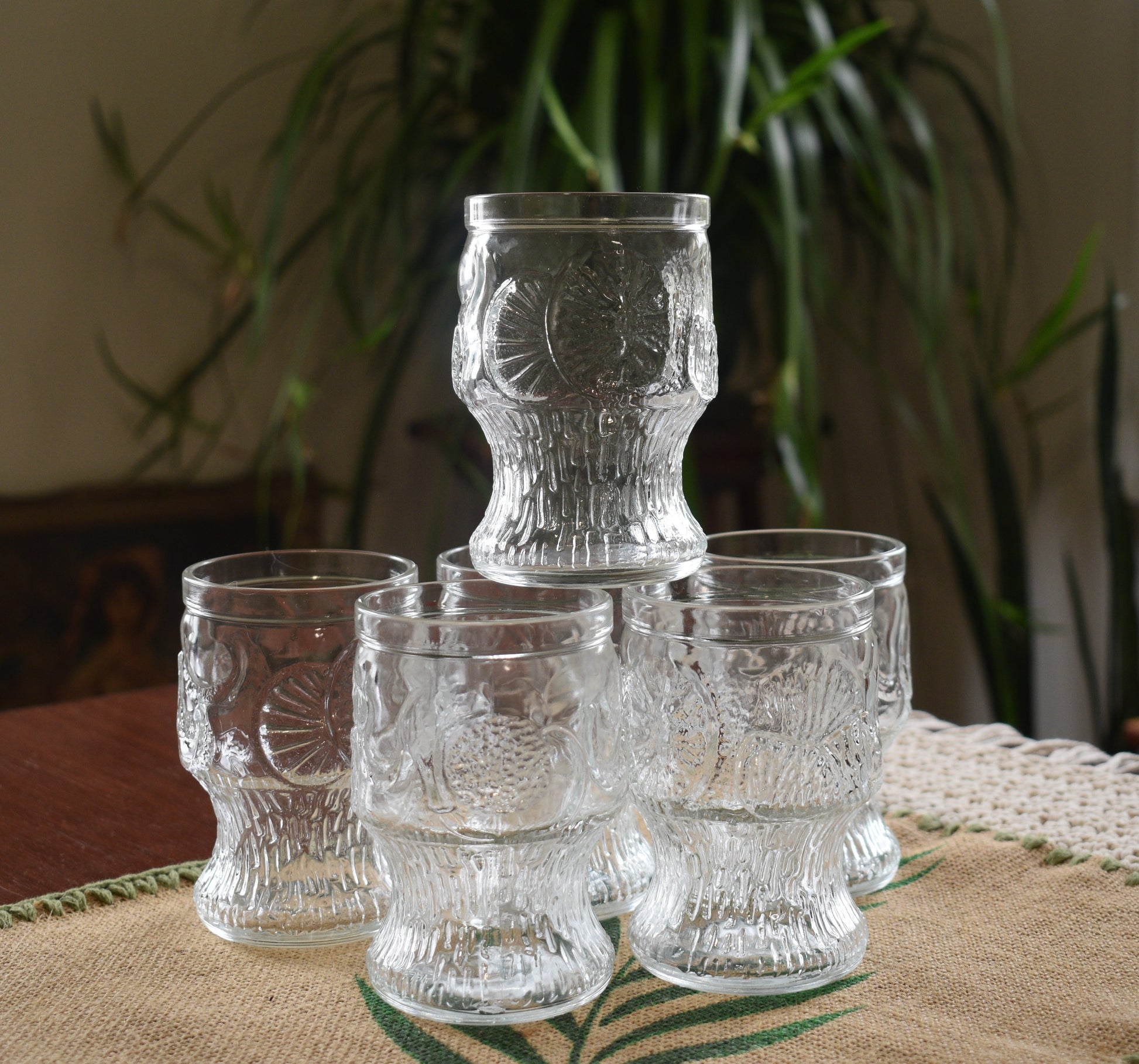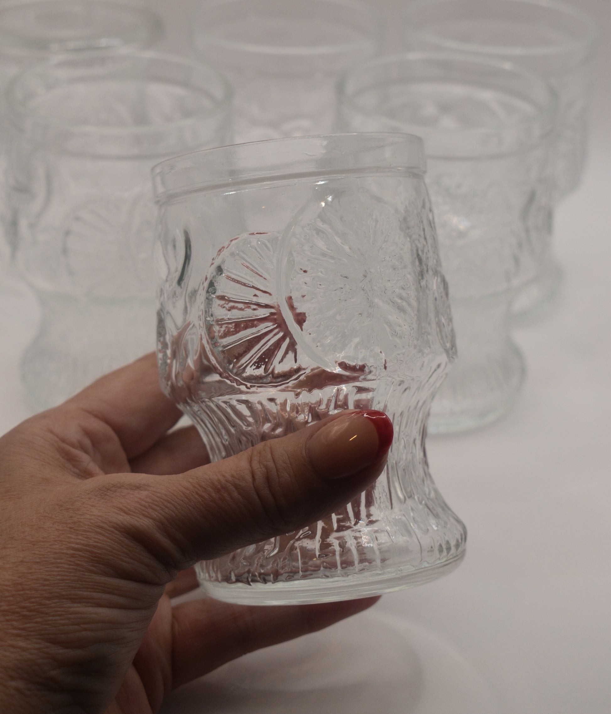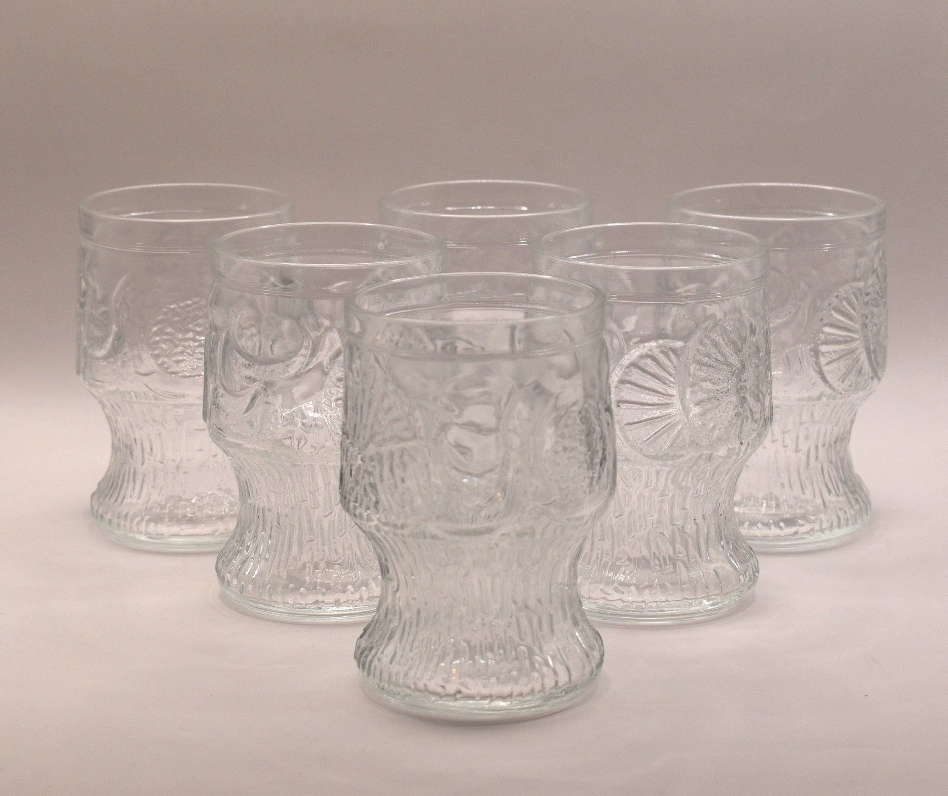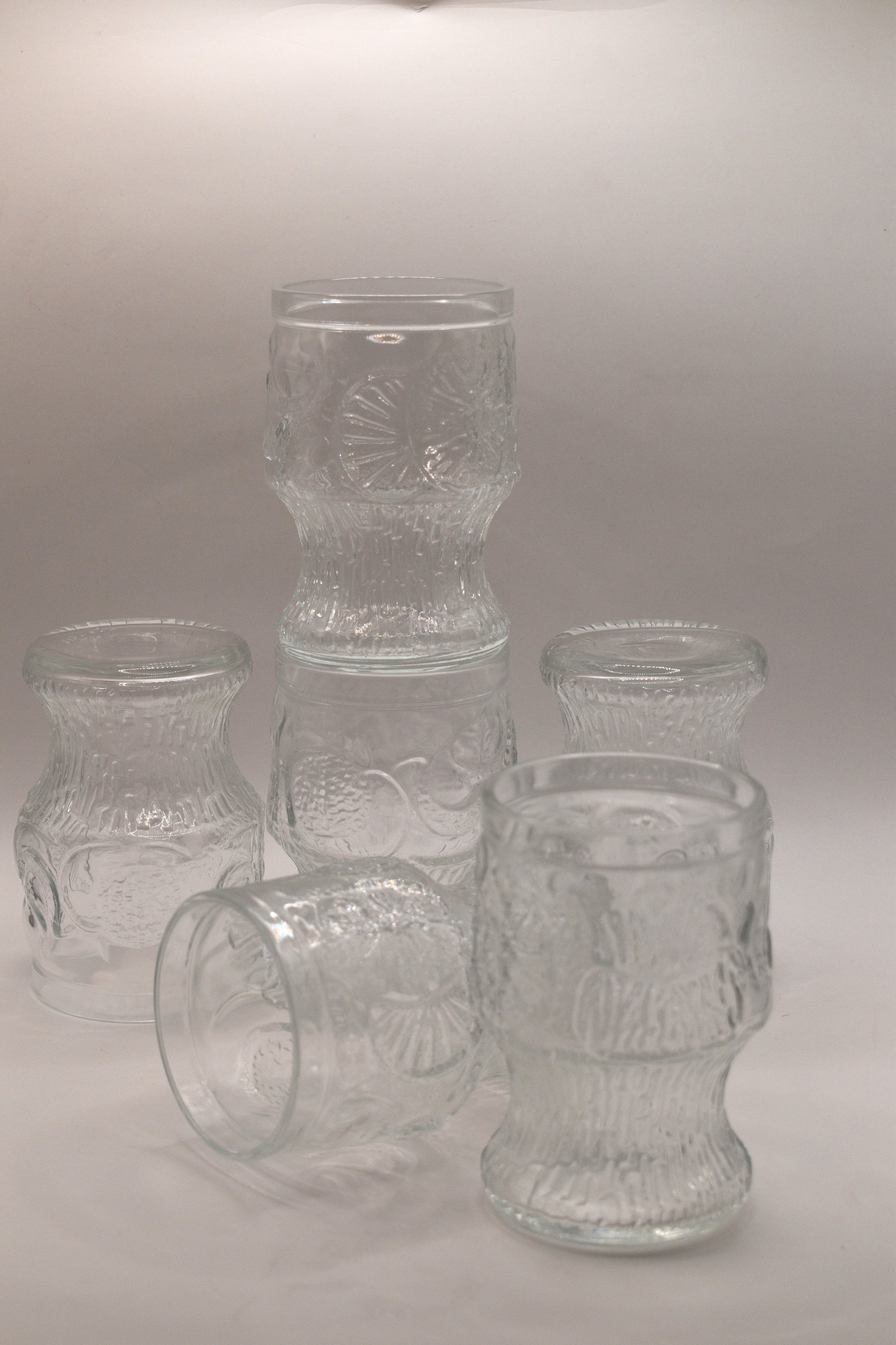 Bring home a slice of 1970s Italian glamour with this charming set of six Fidenza Vetraria tumblers. Each glass showcases a delightful floral and fruit motif paired with a tactile textured base that adds character and grip. Crafted in Italy during the golden age of glassware design, these beauties are built to last—sturdy, reliable, and ready for everyday enjoyment or special occasions. A playful nod to vintage style that feels as good as it looks.