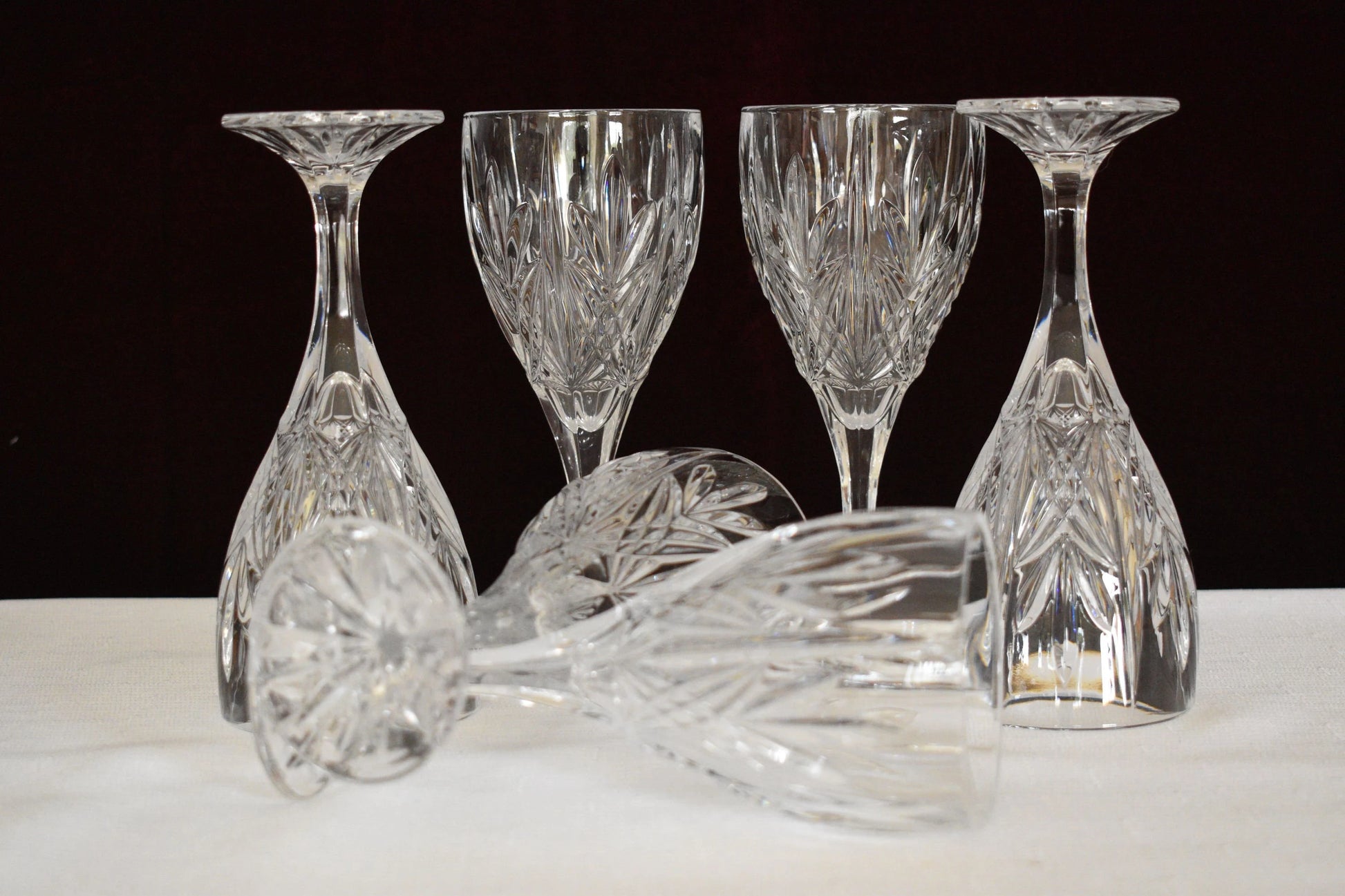 Create a sophisticated atmosphere with this set of 6 Vintage Heavy Cut Crystal Wine Glasses or Water Goblets, featuring a faceted stem and a cut daisy-style flower in the bottom of the foot. Their generous bowl capacity ensures ample liquid to savor. Ideal for weddings or any fine dining experience.