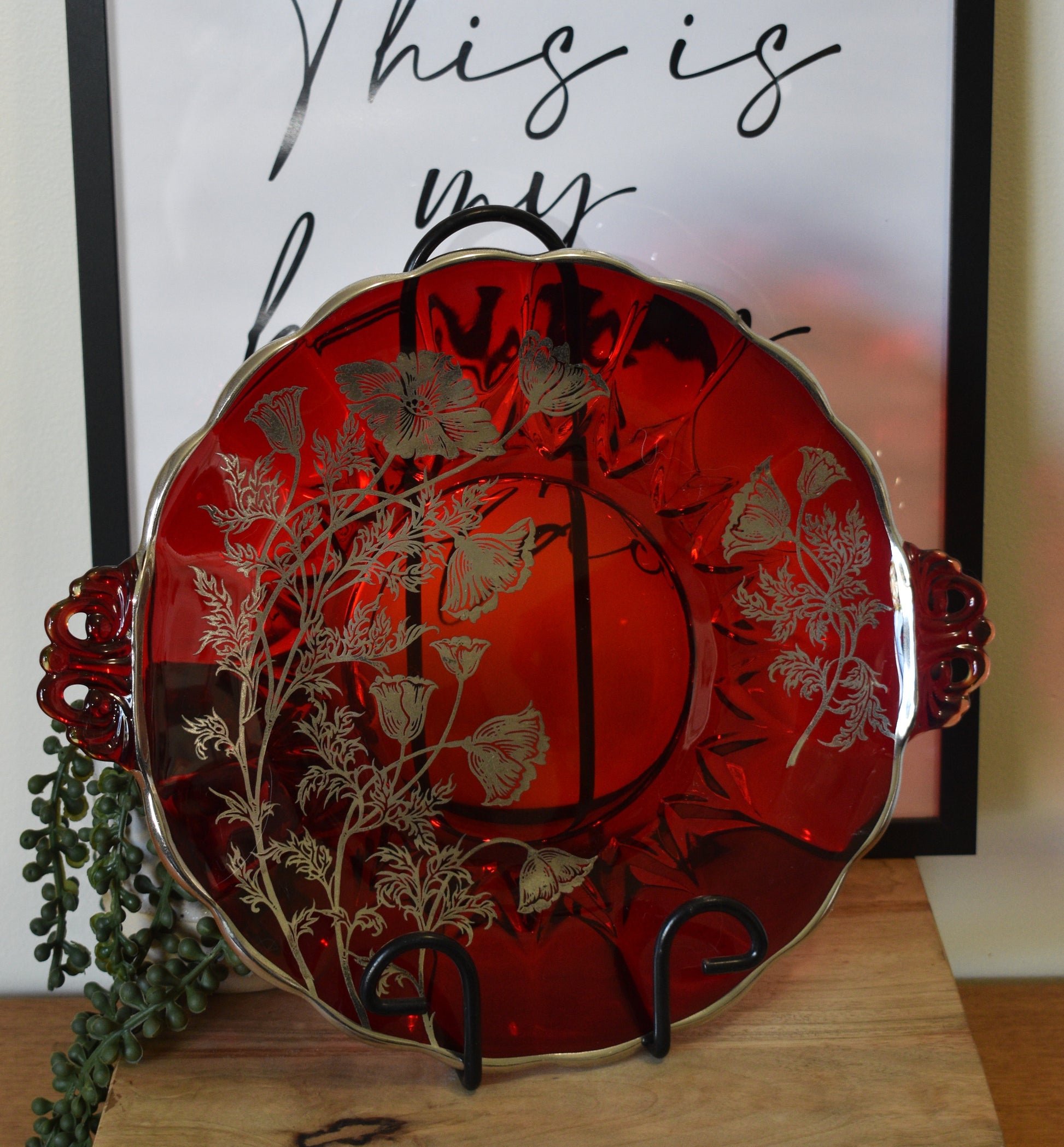 Vintage New Martinsville Ruby Red "Janice" Silver overlay poppy handled cake plate