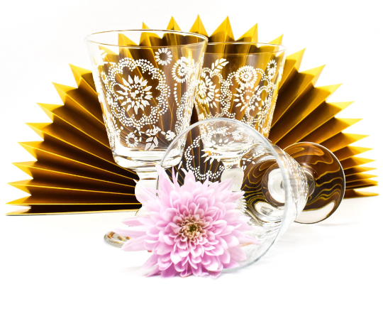 Vintage Pretty White Painted/Stenciled floral design. Short frosted ball stemmed wine glass/water goblet. Set of 3