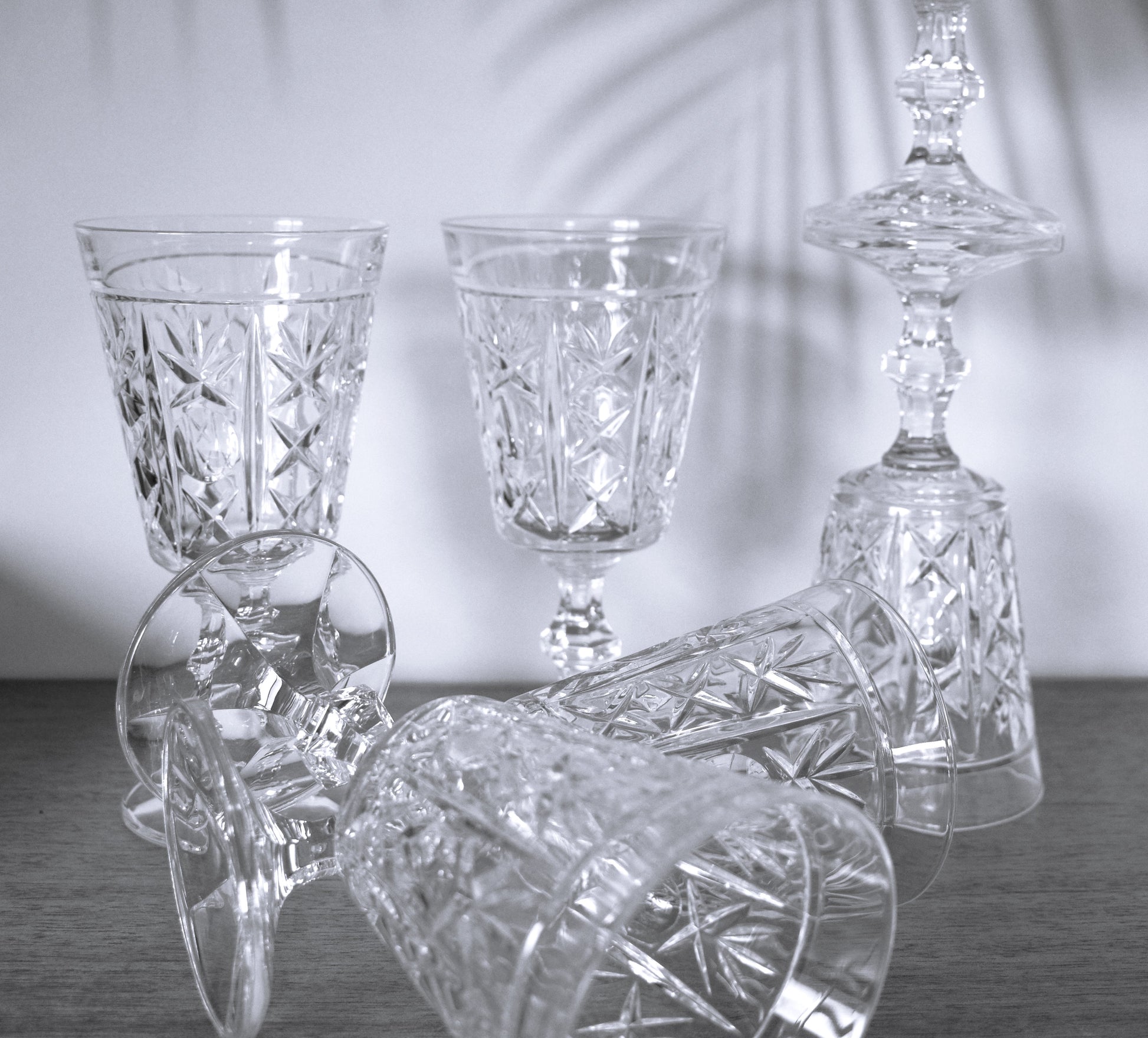 Enhance your home with this exquisite set of 6 "London" Water Goblets from Vintage Royal Crystal Rock. Crafted in Italy, each goblet is made of solid glass and adorned with a beautiful cut pattern of crosses, lines, and a smooth indented circle. Indulge in the luxurious feel and timeless elegance of these goblets, perfect for any vintage lover or as a stunning addition to your bar collection. Each goblet is in excellent condition, and don't forget to also check out the matching wine glasses (discontinued pieces)!