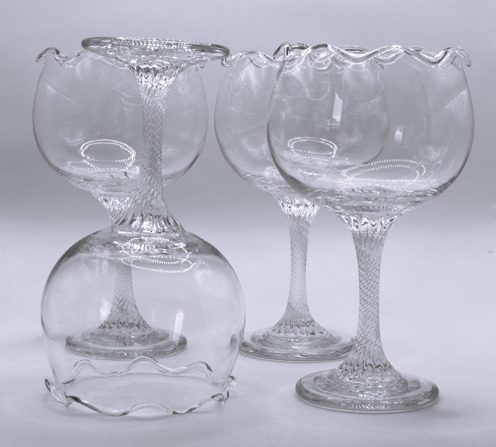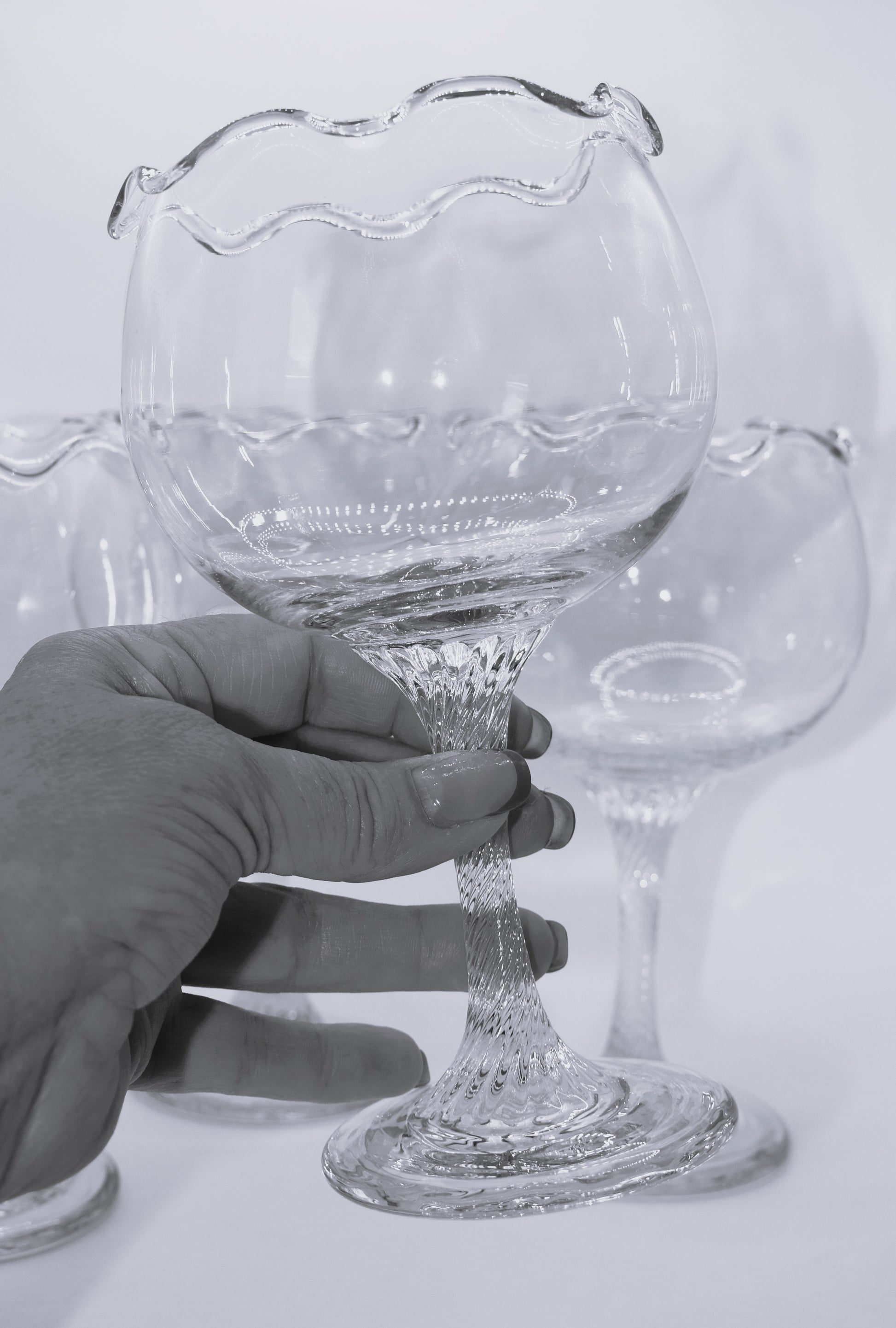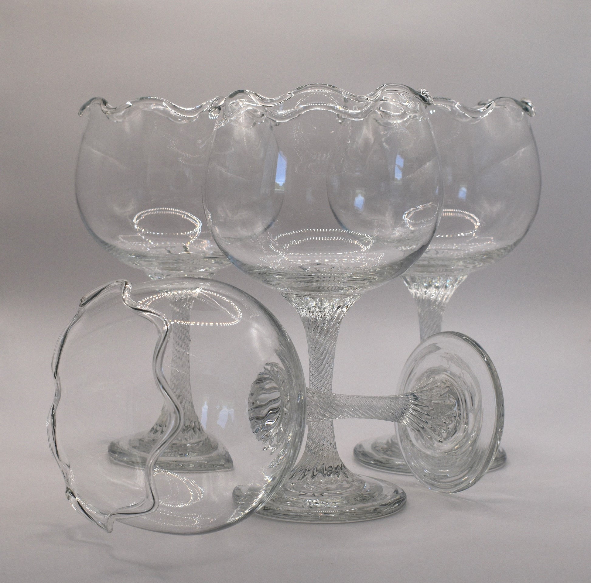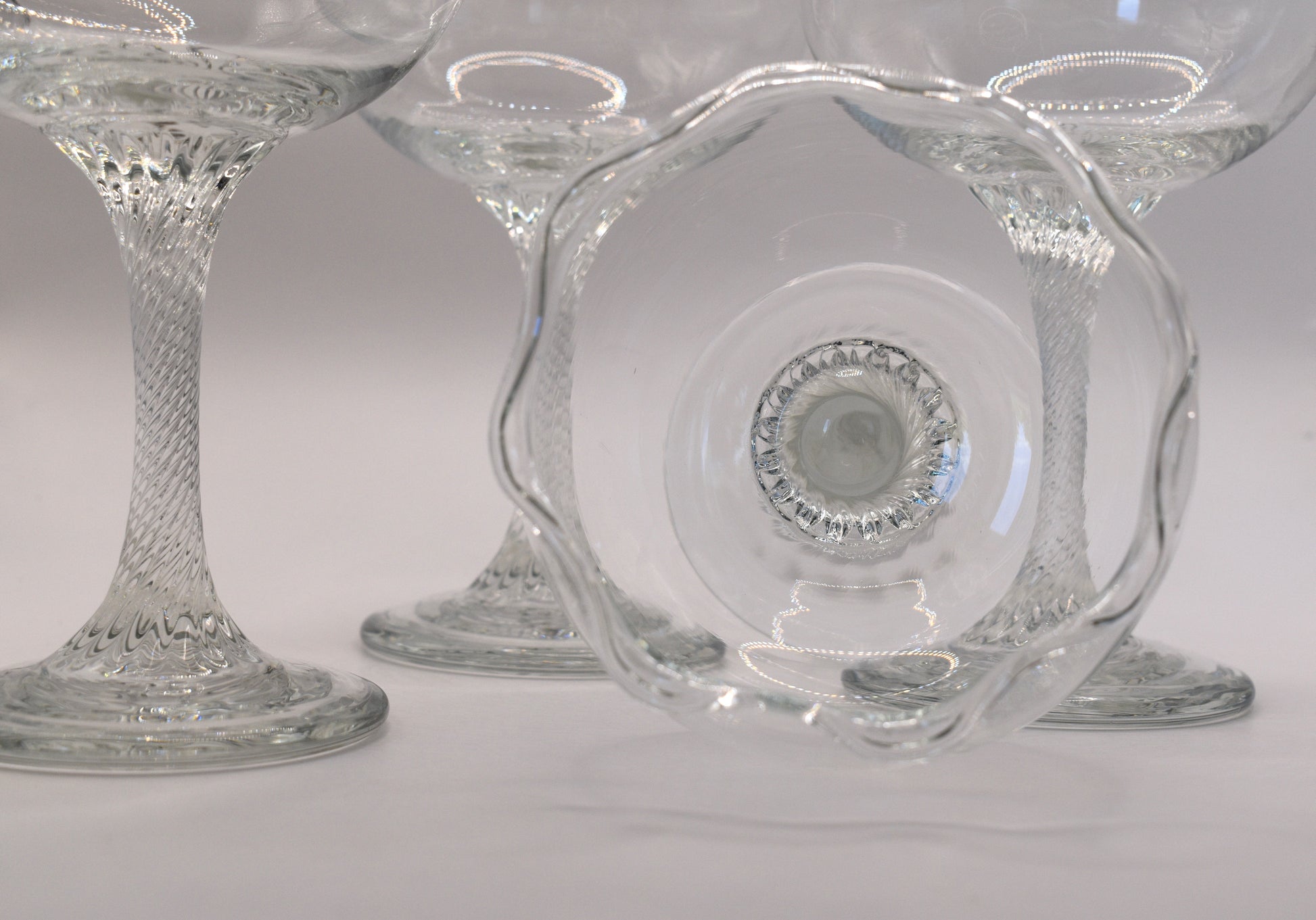 Stunning set of 4 vintage dessert or starter glasses featuring beautiful tall twisted stems and a ruffled/scalloped rim.
