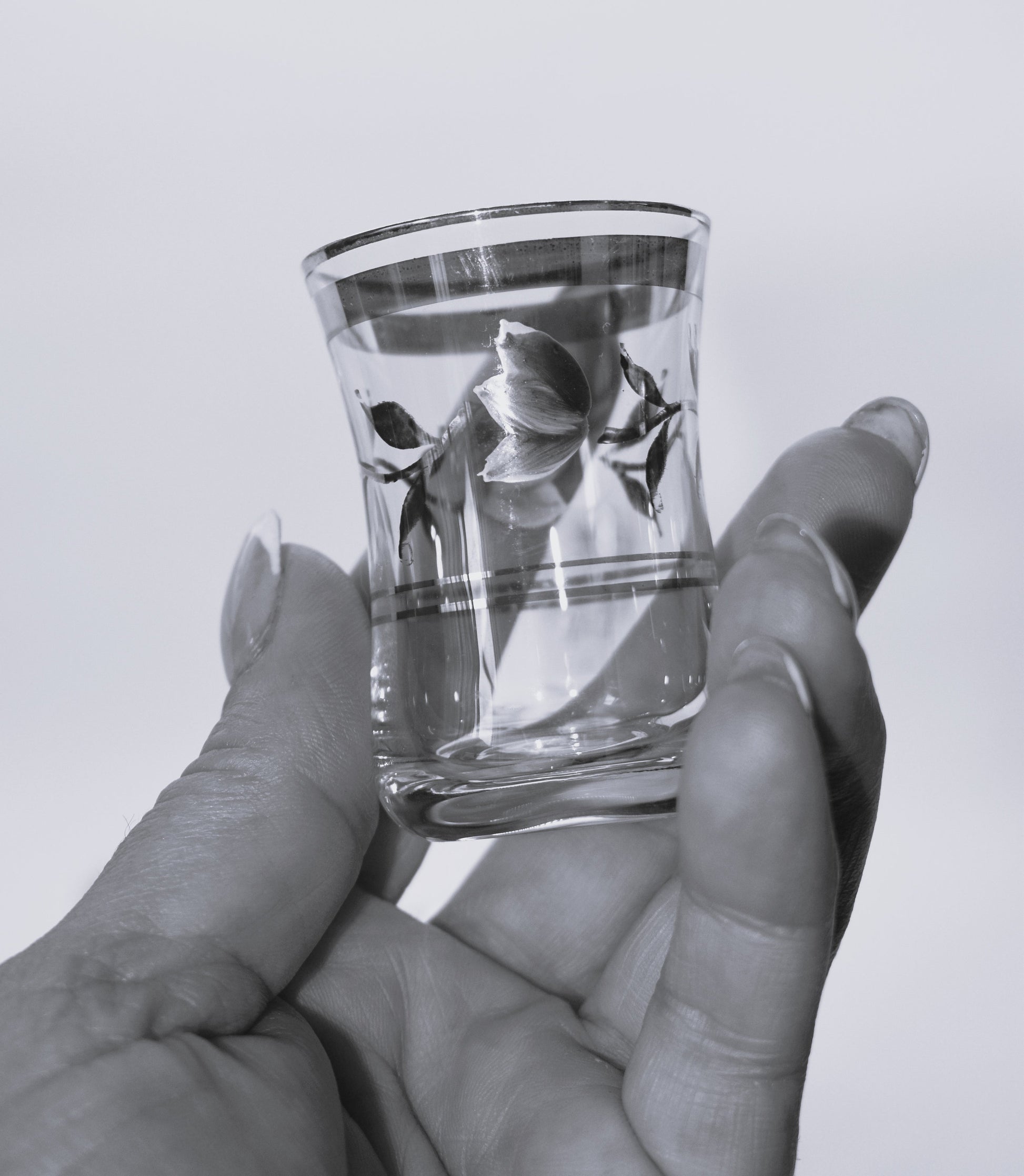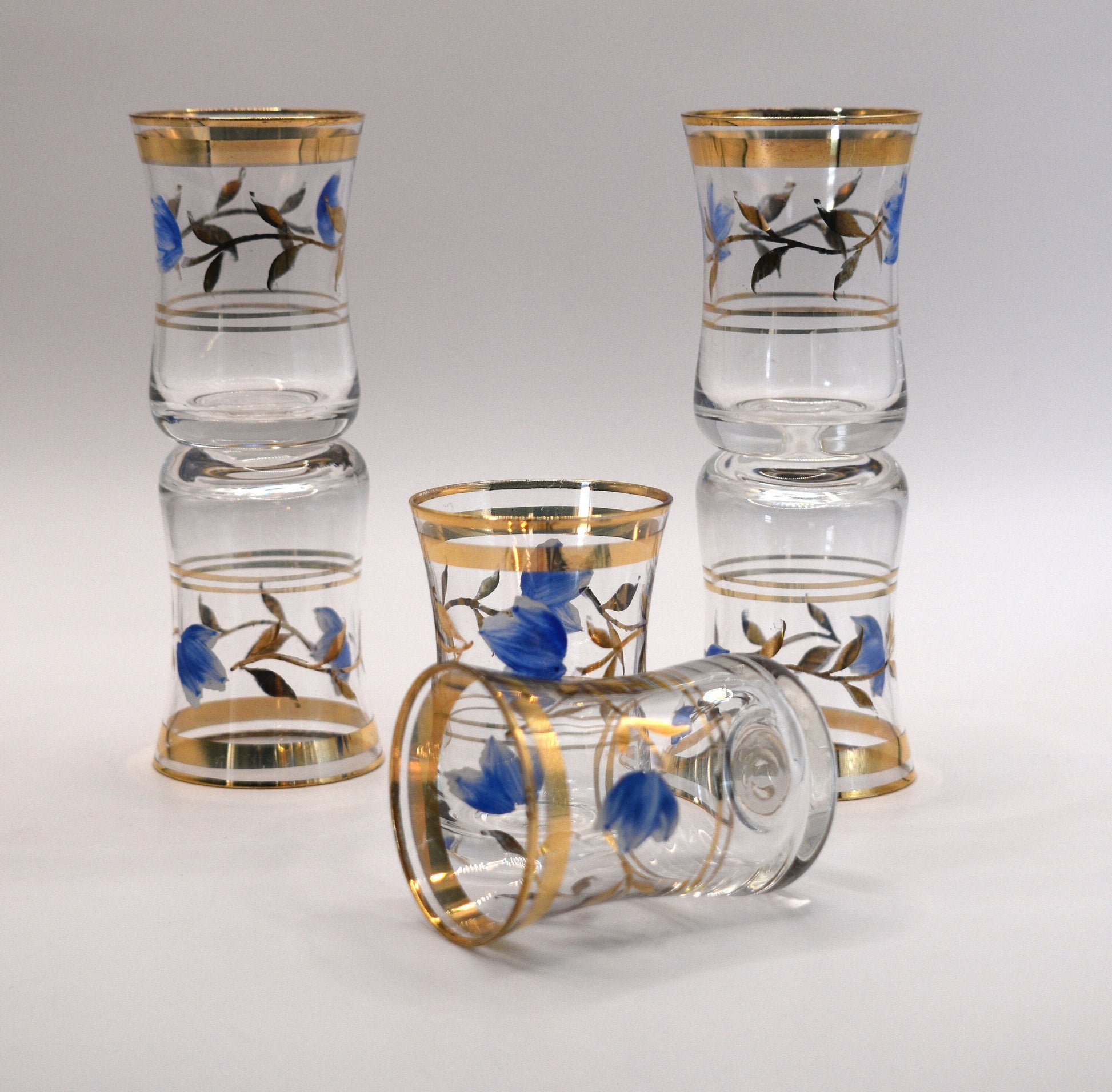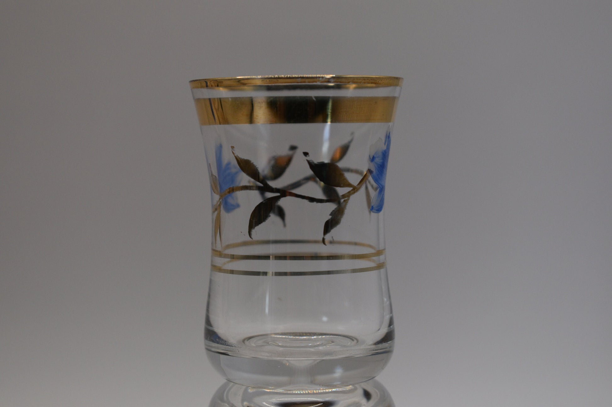 Vintage stemless shot glasses with hand painted blue flower design with leaves and gold trimmings. Sherry Glasses. Port Glasses. Set of 6
