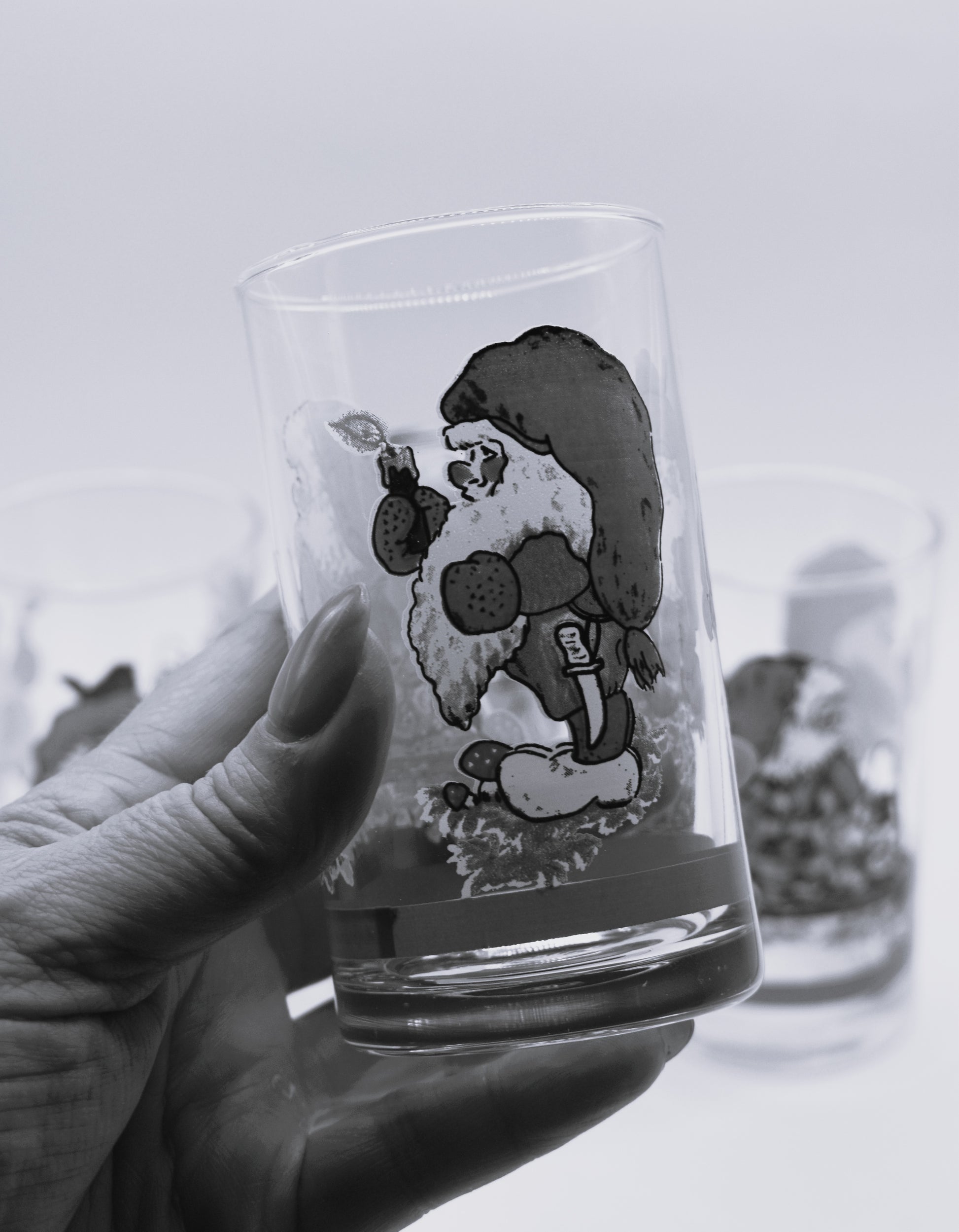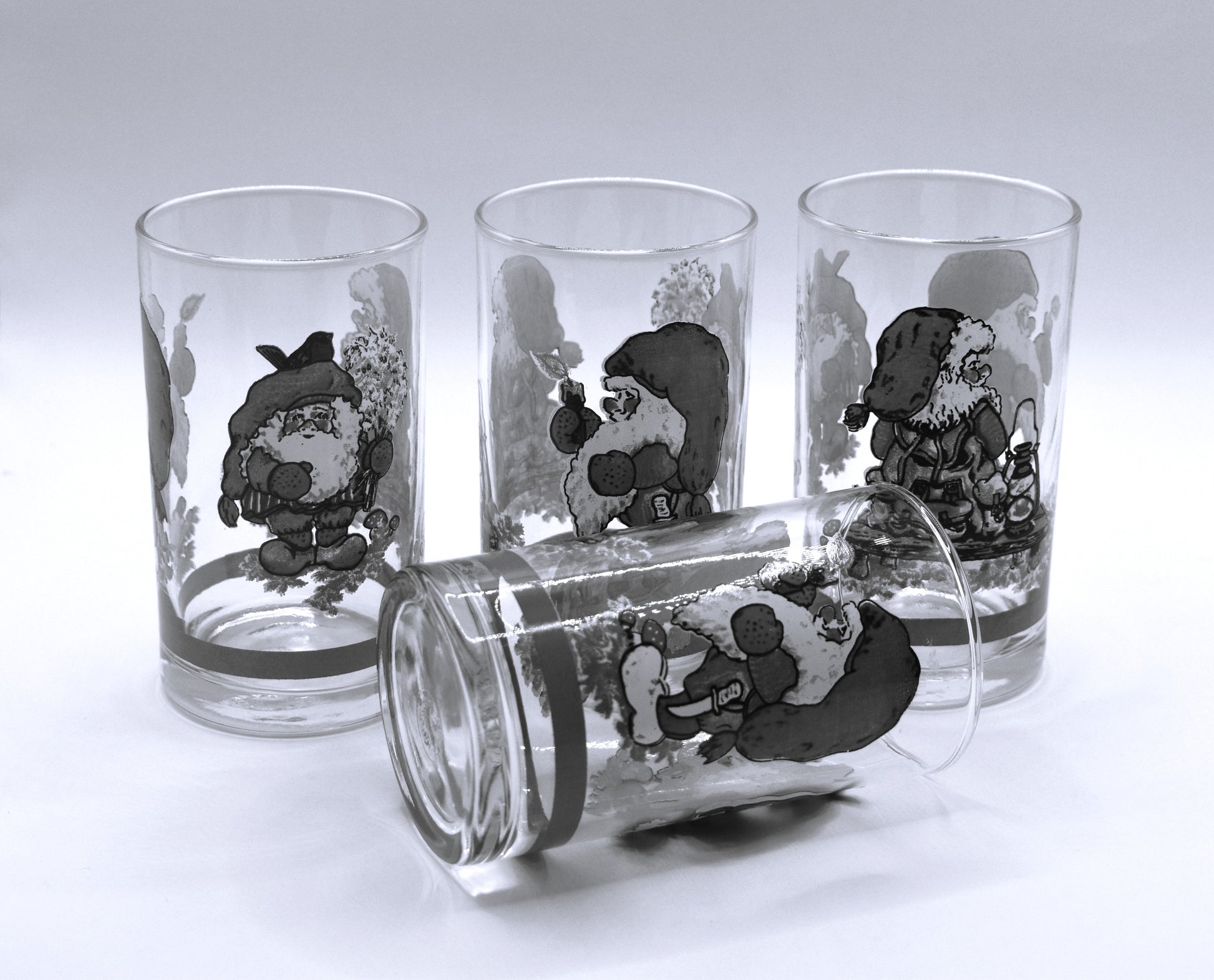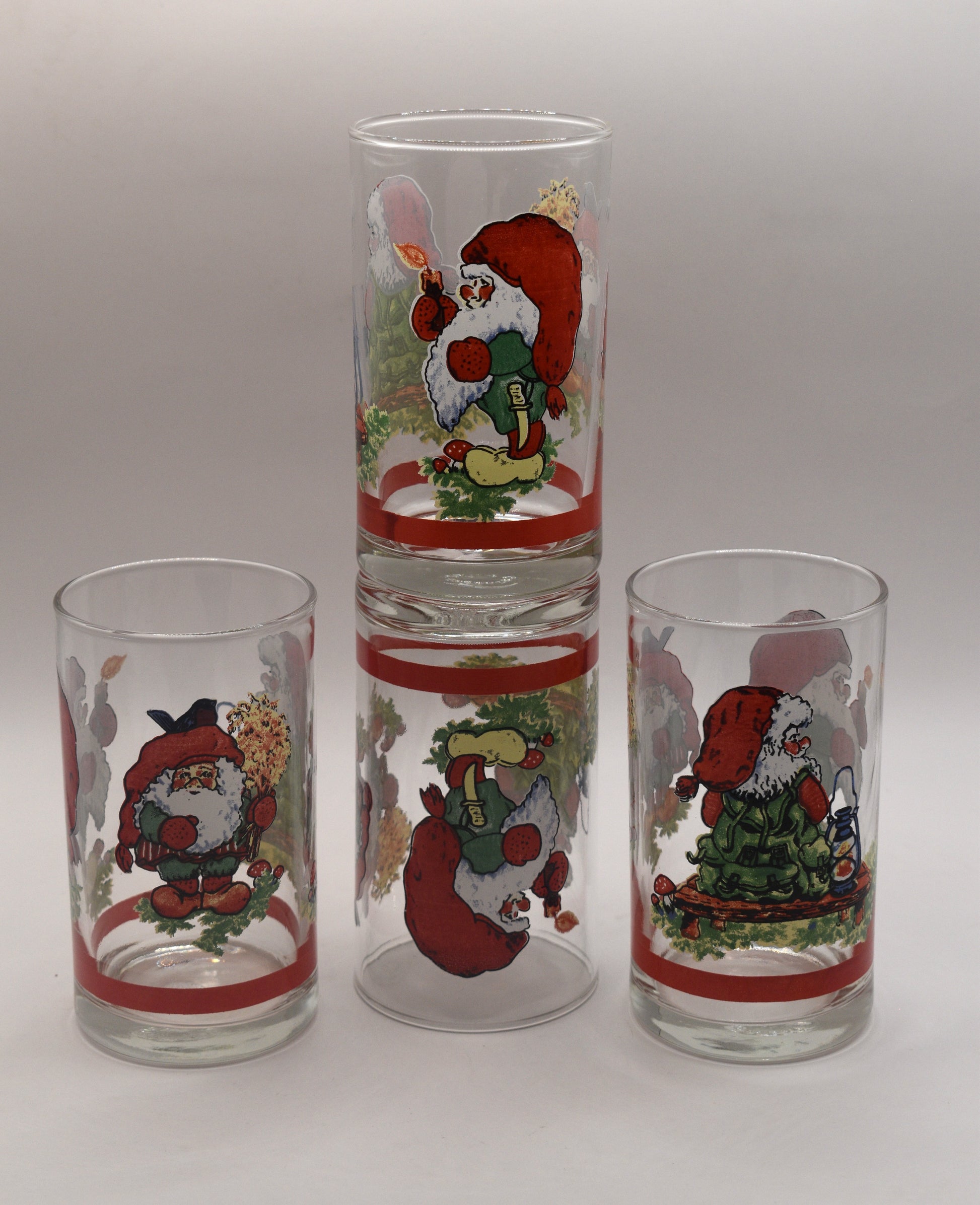Fabulous glass tumblers perfect for non alcoholic beverages. Three panel gnome tumbler by Firna made in Indonesia. Screen printed glass, stamped on bottom. Great condition. 1980's. Not specifically Christmas but could be.