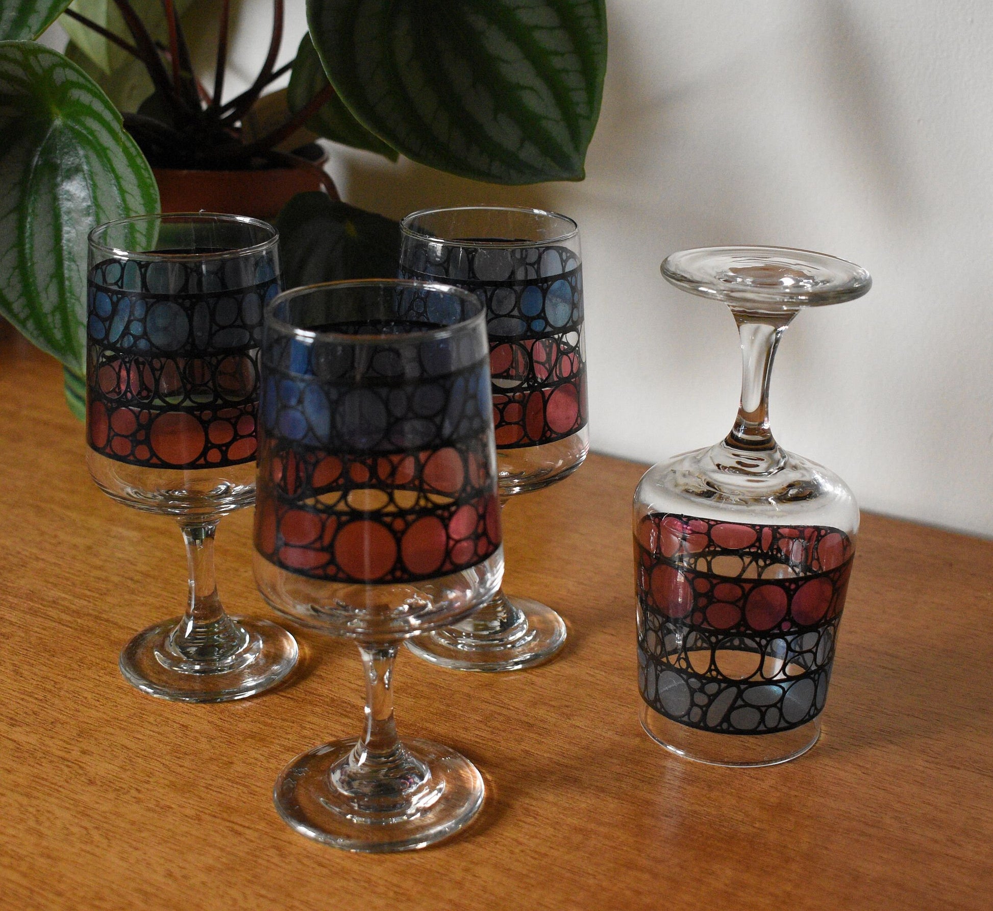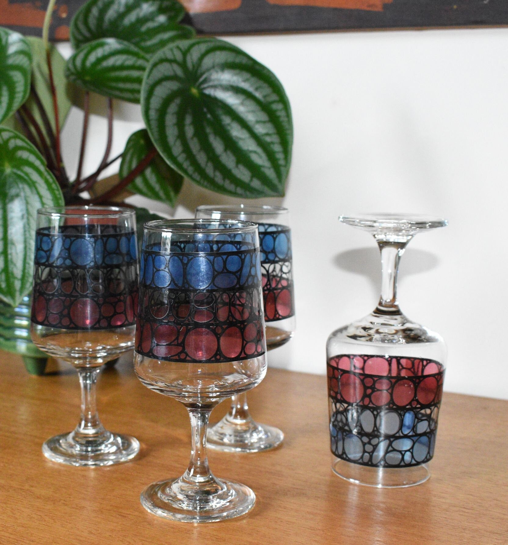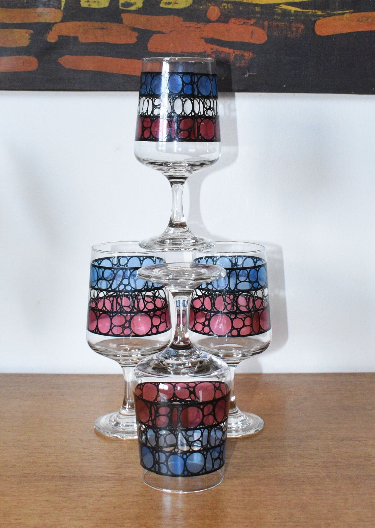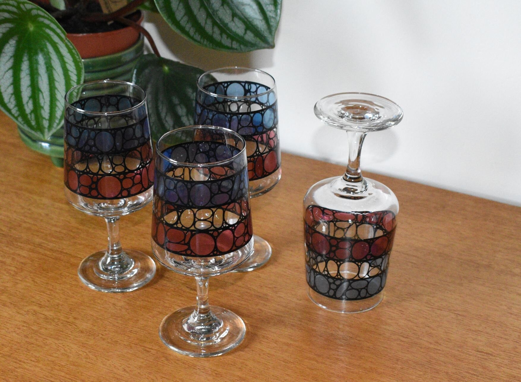 Vintage Wine Glasses. Mid Century Stained Glass design. Set of 4
