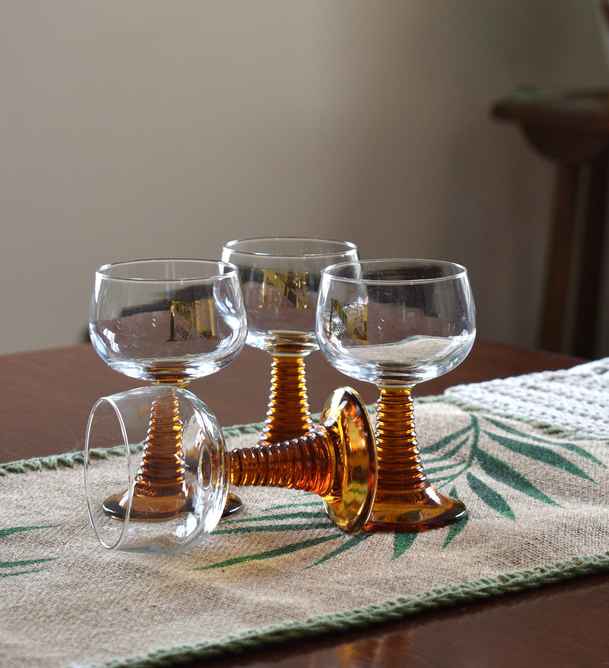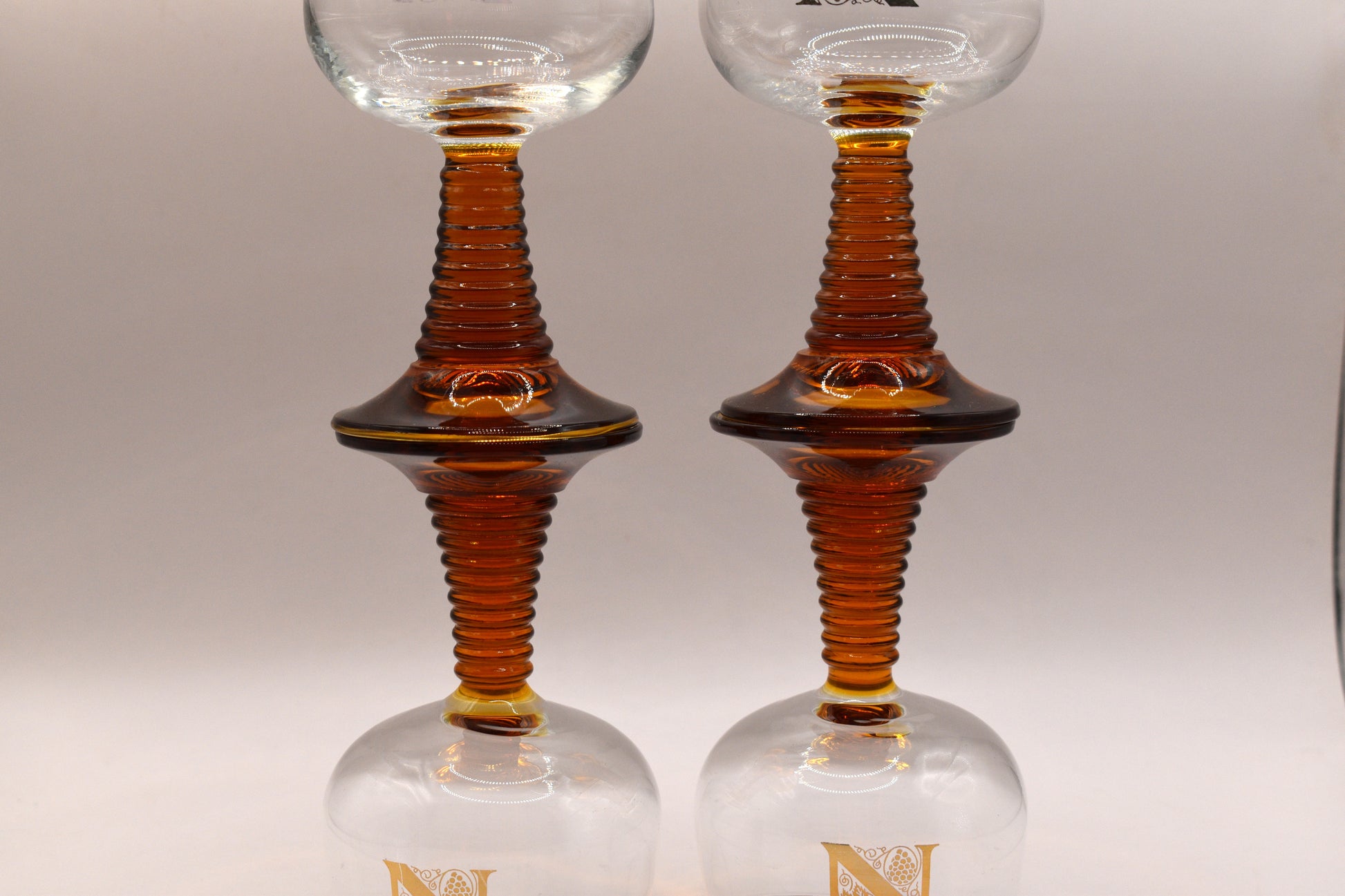 Lovely set of 4 Roemer Wine glasses made in France. Stunning amber coloured beehive stem. All glasses feature a gold grapevine pattern with the Letter N. One "N" on one glass is worn (see photo) other than this these glasses are in perfect condition and would make a lovely addition to any vintage/retro styled setting or bar.