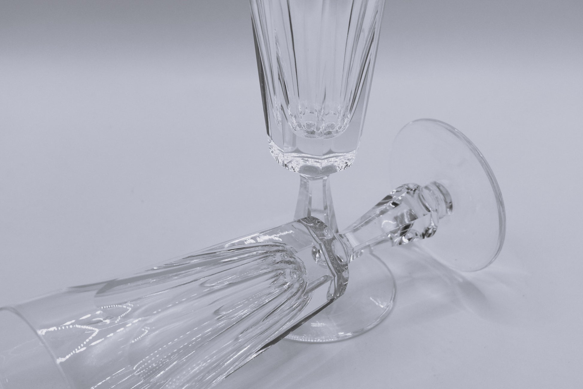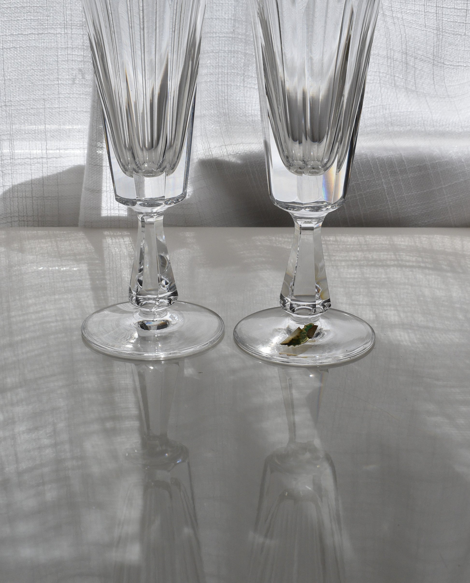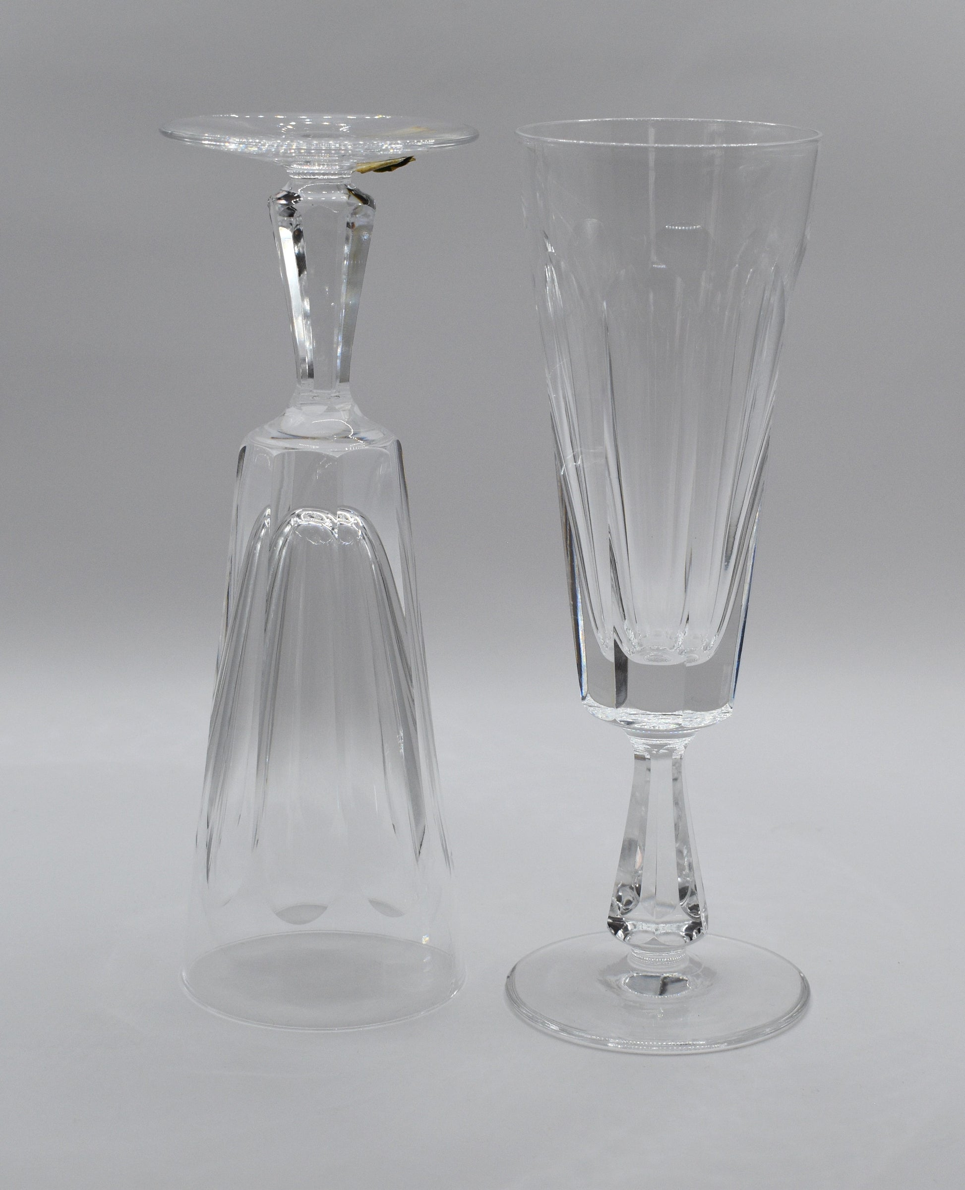 Stunning Waterford Crystal! This wonderful set of 2 Champagne Flute are from the "Glencree" pattern which was introduced in 1962. The name was inspired by the gently wooded Glencree Valley. The bowl consists seven arched cut panels sitting on a six sided baluster shaped stem and clear round base.